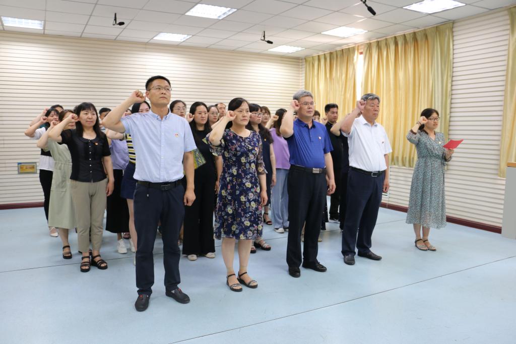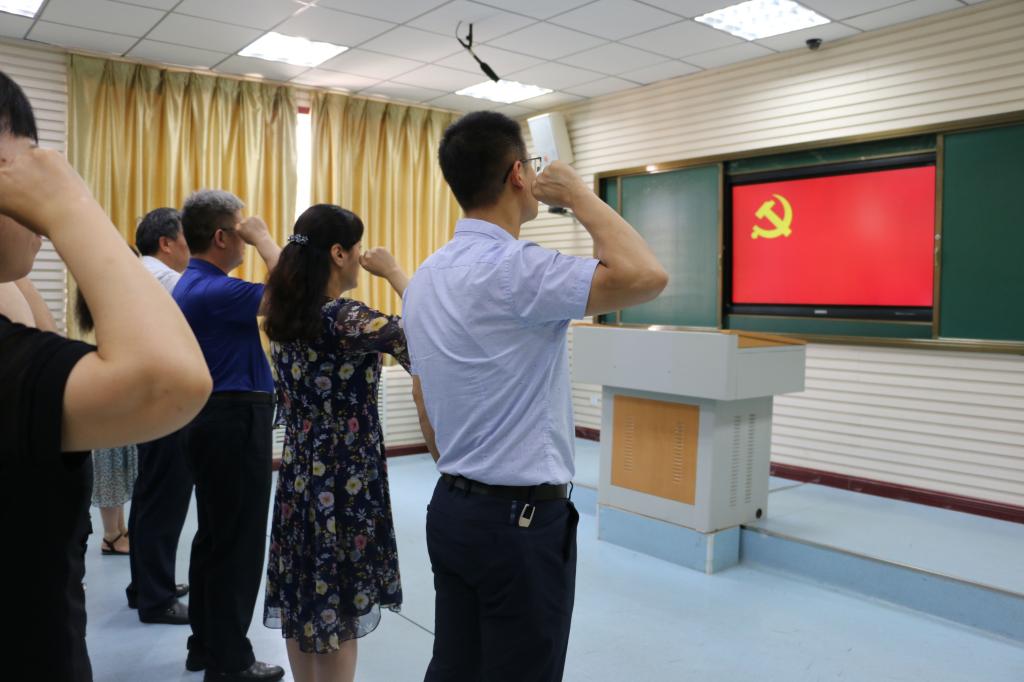 在副院长单清清的带领下,全体党员面向鲜红的党旗,举起右手庄严宣誓:“我志愿加入中国共产党,拥护党的纲领,遵守党的章程,履行党的义务,…….. 随时准备为党和人民牺牲一切,永不叛党。”铿锵有力的誓言代表的是党员一份庄严承诺、一份坚定决心,也是作为共产党员应有的责任担当。