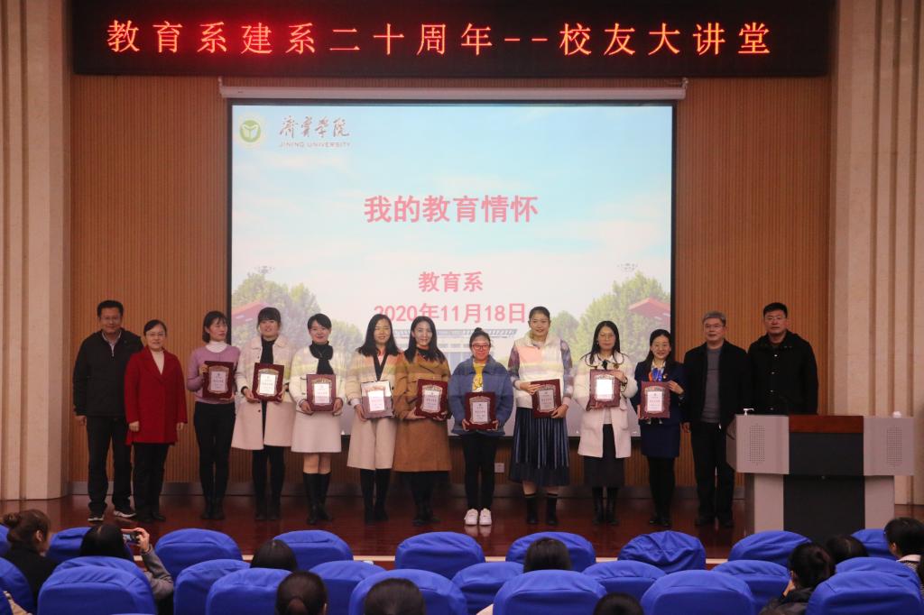 来自教学一线的九名校友均在较短的工作时间内脱颖而出,在国家级、省级和市级各项教学比赛中屡获大奖,成为岗位上的佼佼者。她们此次满载荣誉重返母校,怀着拳拳之心、殷殷之情,以现身说法的方式,分别从师生情谊、专业认知、职业规划、校园生活和未来发展等方面与师弟师妹进行经验分享和建议指导,言辞恳请、语重心长、引人入胜,让现场的师生深切感受到了她们对母校的留恋、对老师的牵挂、对教育系的感恩和对师弟师妹的殷切期许。会场从始至终都洋溢着笑声、掌声和赞叹声,充满了温馨与和谐。在与现场观众对话交流结束之后,与会领导向校友颁赠了济宁学院“校友大讲堂”的纪念铭牌并与之合影留念。