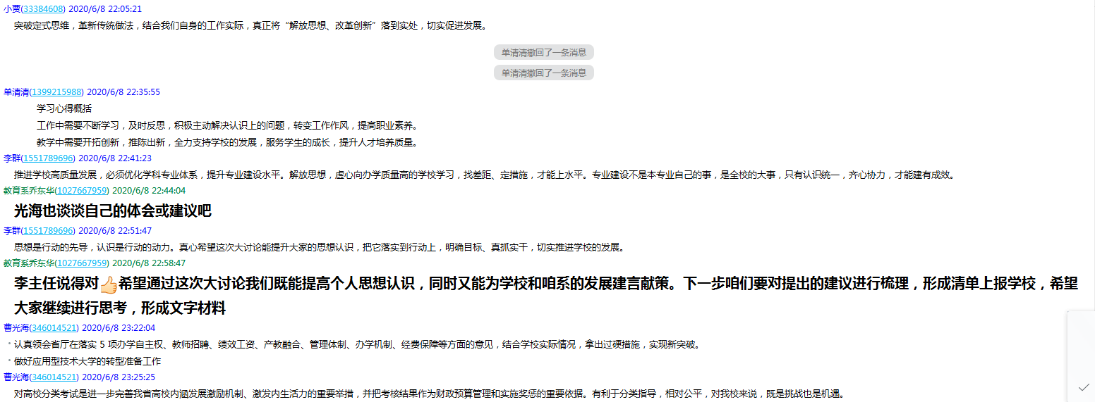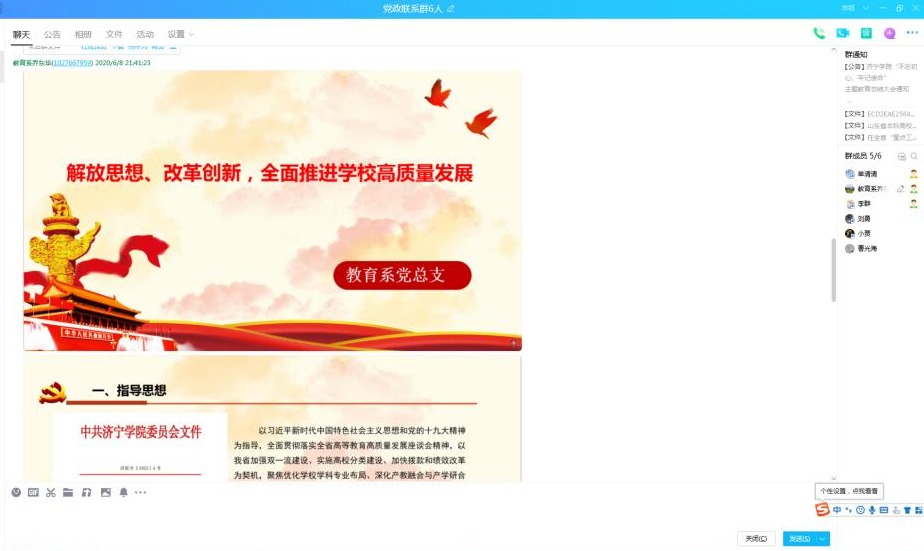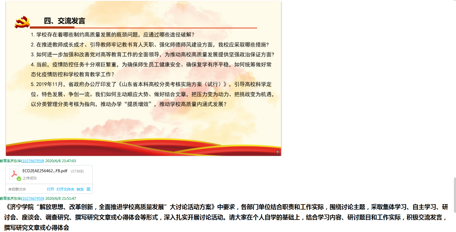 6月8日,教育系党总支通过QQ分享线上方式,组织开展“解放思想、改革创新,全面推进学校高质量发展”学习研讨活动,活动由党总支书记乔东华主持,系领导班子成员参加。