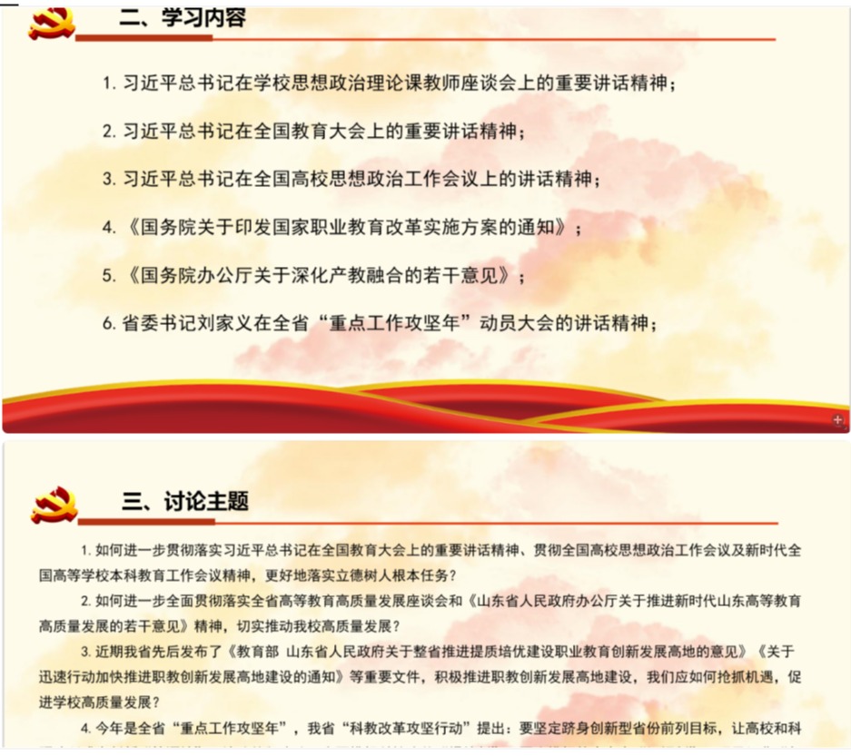 会上集体学习了省委书记刘家义在全省“重点工作攻坚年”动员大会的讲话精神和在全省高校高质量发展座谈会上的讲话精神、《山东省人民政府办公厅关于推进新时代山东高等教育高质量发展的若干意见》《山东省本科高校分类考核实施方案(试行)》《济宁学院“解放思想、改革创新,全面推进学校高质量发展”大讨论活动方案》等内容。随后,大家进行了认真讨论,畅谈各自的看法和心得体会。大家表示,一定要通过此次学习讨论活动,进一步提高思想认识,明确努力方向,真抓实干,为推进学校高质量发展做出应有贡献。