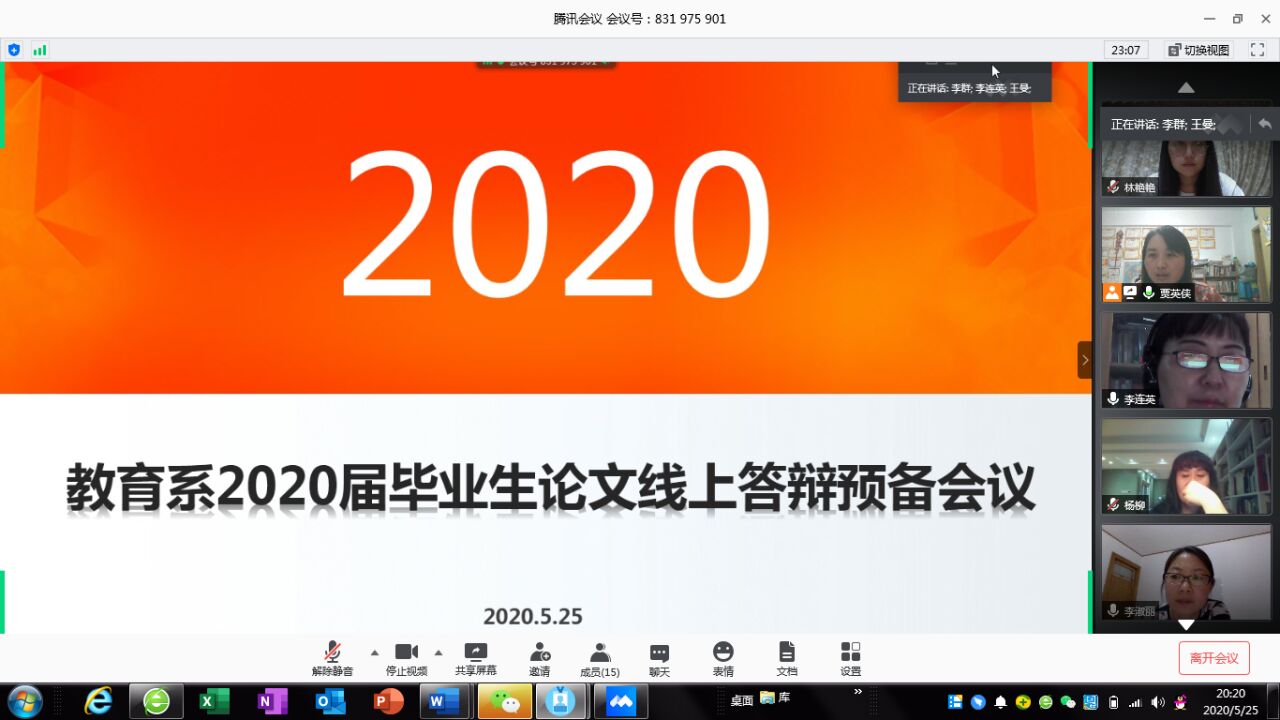2020年5月25日晚20:00教育系副主任贾英侠应用腾讯会议组织召开论文答辩工作预备会议,教育系主任李群、各专业论文负责人及14位答辩小组组长参加会议。贾英侠首先对答辩平台使用方法进行了讲解和演示,然后对本次答辩工作要注意的事项进行了强调说明。