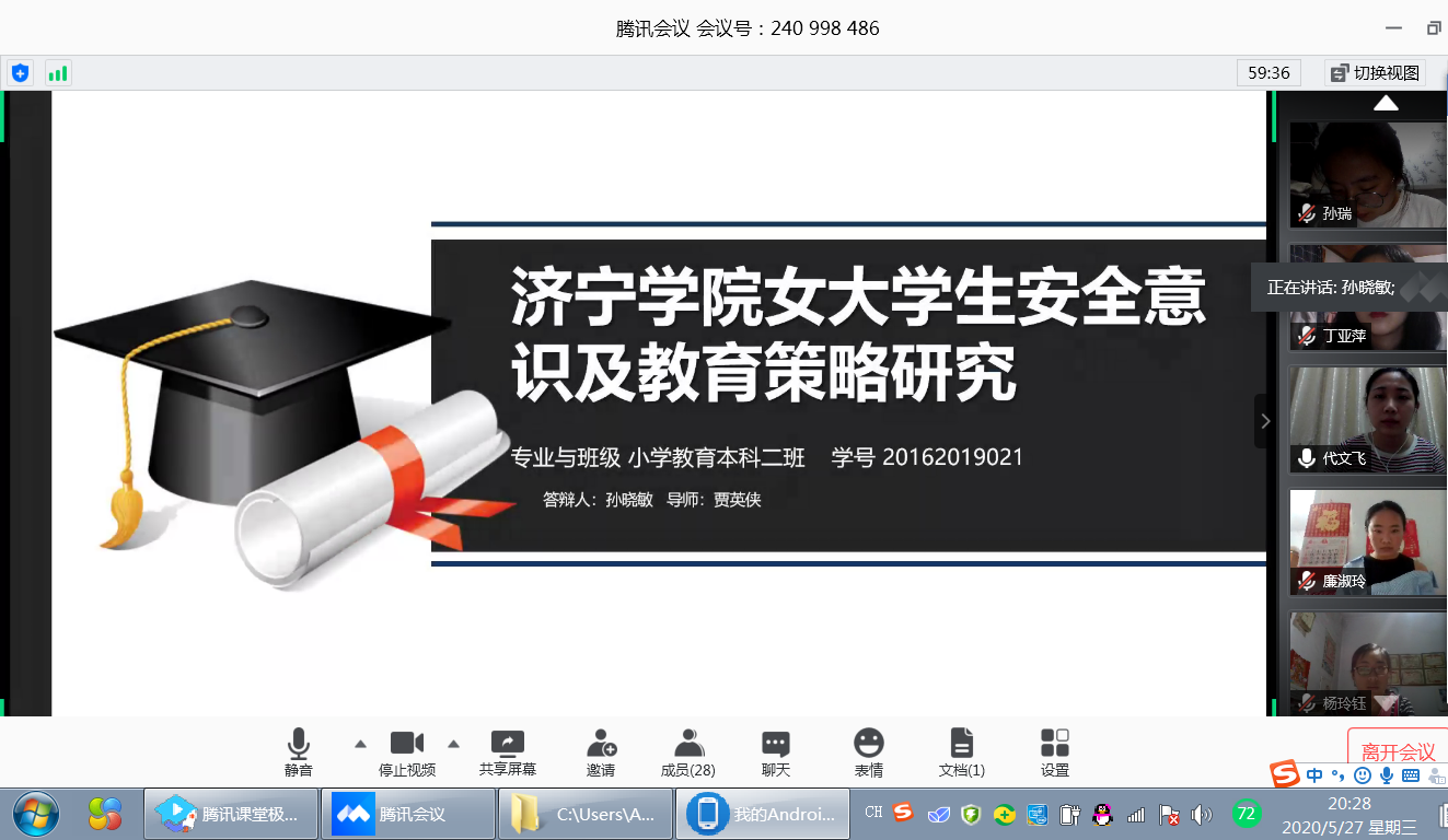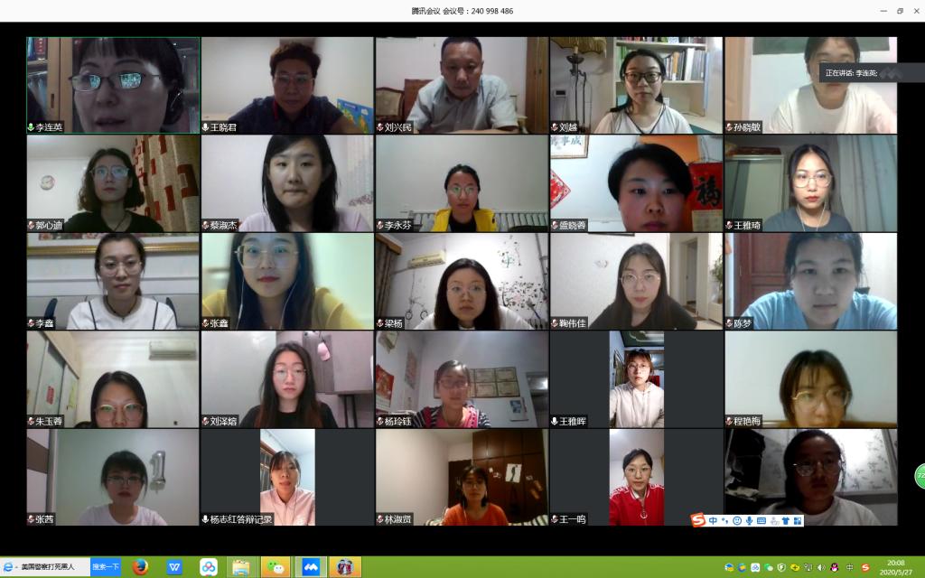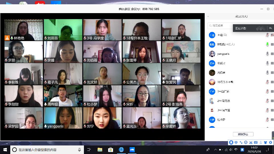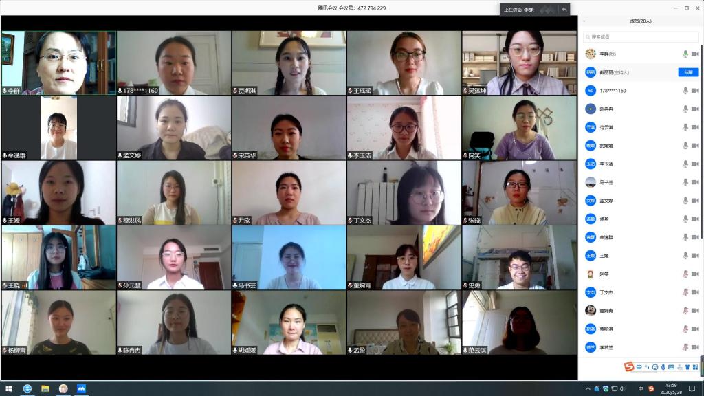2020年5月27日,各答辩小组组长组织老师及学生相约进入提前预约好的腾讯会议室。组长先是向参加本次答辩的同学详细介绍本次论文答辩工作的程序及注意事项,整体测试平台运行情况;随后按照答辩流程组织学生进行答辩演练,确保每位学生能正确熟练地使用平台的静音、开启视频、共享屏幕等功能,为论文的线上答辩顺利进行做好充分的准备。