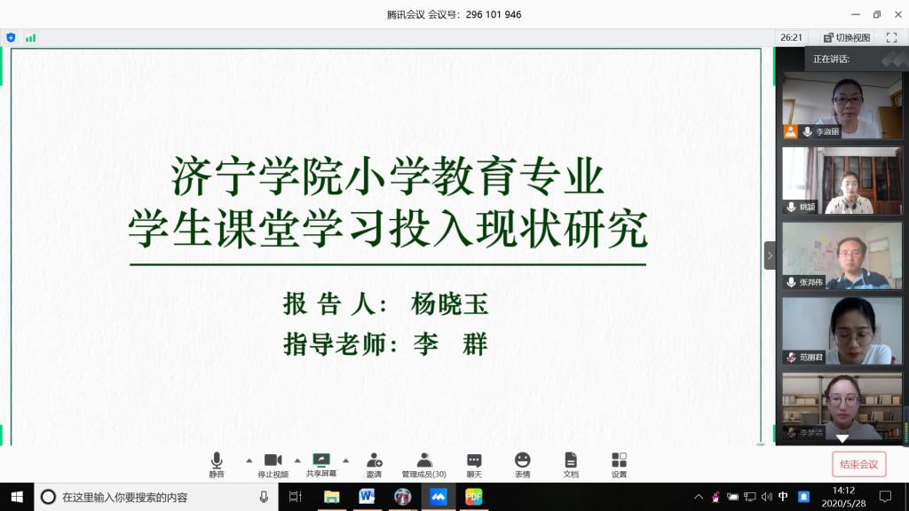2020年5月28日下午14:00,教育系44位论文答辩老师与心理学、小学教育、学前教育三个专业共310名学生相约相聚在云端,正式开启2020届本科毕业生论文答辩工作。本次线上答辩三个专业共14个小组同时进行,每个小组由3名2017级学生参与旁听,并负责答辩记录和其他服务工作。