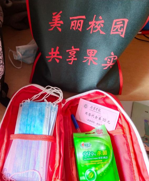 学校南门秩序井然,我们在值班老师的带领下根据入校流程做好身份核验、行李和手部消毒、体温监测、健康码查验等工作。“欢迎回家!”系党总支书记乔东华带领所有辅导员老师一大早就在学校南门等候“回家”的学生,老师们亲切地问候我们假期过得如何,返校后有什么打算。同时我们也收到了乔东华书记代表学校发放的装有口罩、体温计、消毒湿巾、餐券和疫情期间校园实用手册的“防疫健康礼包”。
