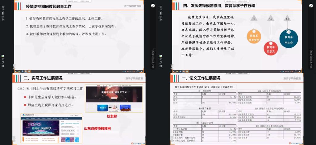随后,刘勇、曹光海、单清清、贾英侠分别汇报了疫情期间的学生工作、教师教育工作、教学工作、毕业论文和实习工作。党总支副书记刘勇紧扣“抗疫”主题,从加强对学生的线上教育管理,完善资助、就业线上服务体系,发挥学生党员和团学干部的模范作用等几方面详细汇报了学生工作的开展情况;365英国上市(集团)公司副院长曹光海结合师范教育的特点,就如何搭建互相交流和学习的平台,探索线上教育的新模式,从而持续不断地推进学生线上学习的热情和兴趣进行了重点说明;副主任单清清以详实的数据向大家介绍了教育系目前的线上教学情况、听课评课情况以及调研情况;副主任贾英侠针对疫情对论文和实习工作造成的冲击以及系里采取的应对措施进行了深入分析和论证。他们在充分肯定已取得成绩的同时,也指出了目前存在的问题和不足,就下一步的努力方向和改进措施提出了各自的想法和建议。