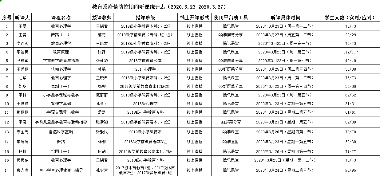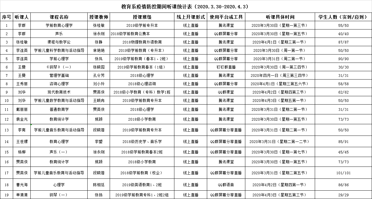 为进一步提升线上教学质量,教育系在第一时间研究督导方案,调整督导方式。自3月16日起,本系开启线上教学听课评课活动。活动要求系内相关人员开展听评课的督导检查,鼓励所有教师进行听评课的相互学习。截至目前,系领导、教学督导、教研室主任听评课共计57门,其他教师听评课共计十余门。教育系已形成良好的在线听评课教学质量监控生态环境。