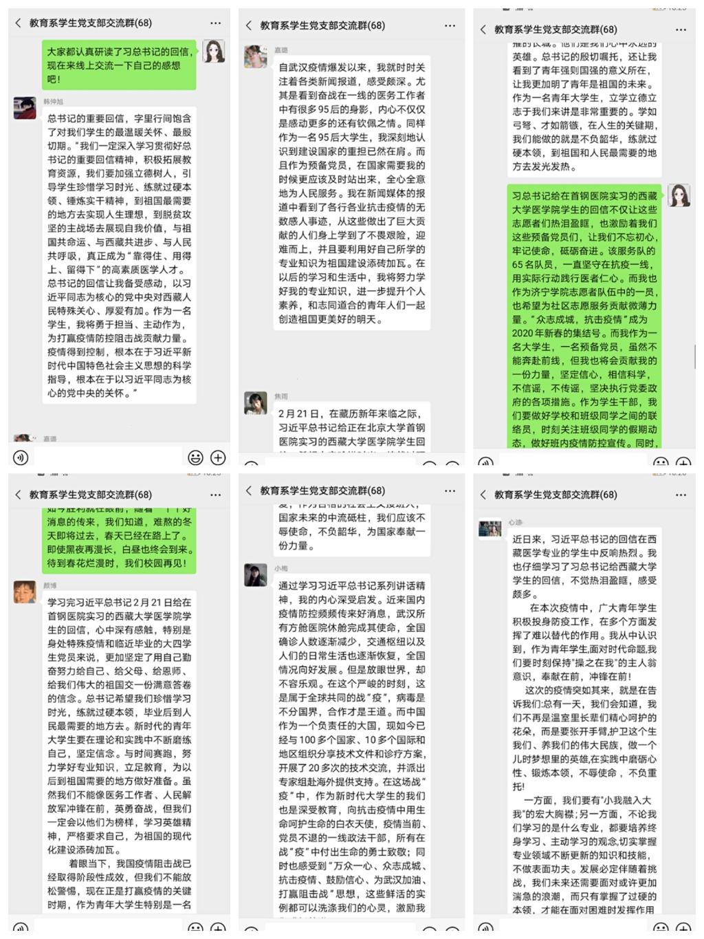 2月21日,在藏历新年来临之际,习近平总书记给正在北京大学首钢医院实习的西藏大学医学院学生回信,希望大家珍惜时光,练就过硬本领,毕业后到人民最需要的地方去,以仁心仁术造福人民。3月22日,教育系学生党支部组以专题视频交流会的形式,集体学习习近平总书记给在北京大学首钢医院实习的西藏大学医学院学生回信精神。 交流会上,支部党员逐一发表学习感想,纷纷表示向那些投身于疫情一线的医务工作者致以崇高的敬意,虽然无法像医务工作者一样救死扶伤,但会以医务工作者为榜样,时刻牢记习近平总书记对广大青年学生的殷切期待,努力学习专业知识,练就过硬本领,锤炼品德修为,积极投身祖国和人民需要的地方,牢记育人使命,用实际行动肩负起新时代青年的使命和担当。