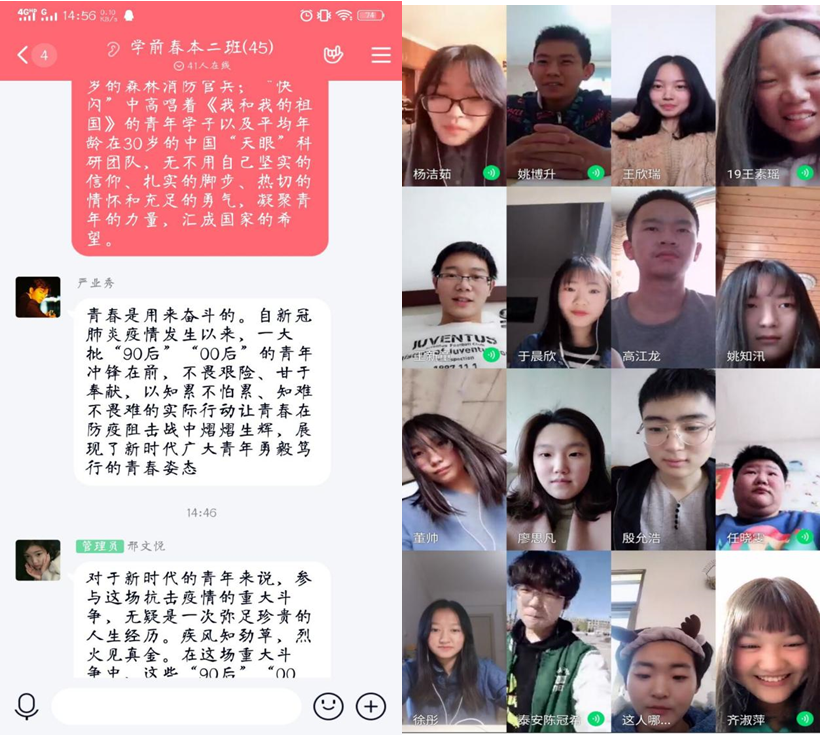活动中,各班团支书带领团支部全体成员学习了《习近平给北京大学援鄂医疗队全体“90后”党员的回信》,利用QQ群、腾讯课堂等网络平台,重点学习了广大青年在新冠肺炎斗争中所体现出来的不畏艰险、冲锋在前的宝贵精神,深刻牢记习近平总书记对广大青年所寄予的厚望,号召教育系全体学生认真学习新时代青年在抗击疫情中的伟大担当和强烈的民族责任感。大家纷纷表示,新时代青年应该树立“国家有难,匹夫有责”的责任意识,学习疫情中舍生忘死的英雄榜样精神,应该不畏风雨、勇挑重担,彰显蓬勃的青春力量,向党和人民交出合格答卷。