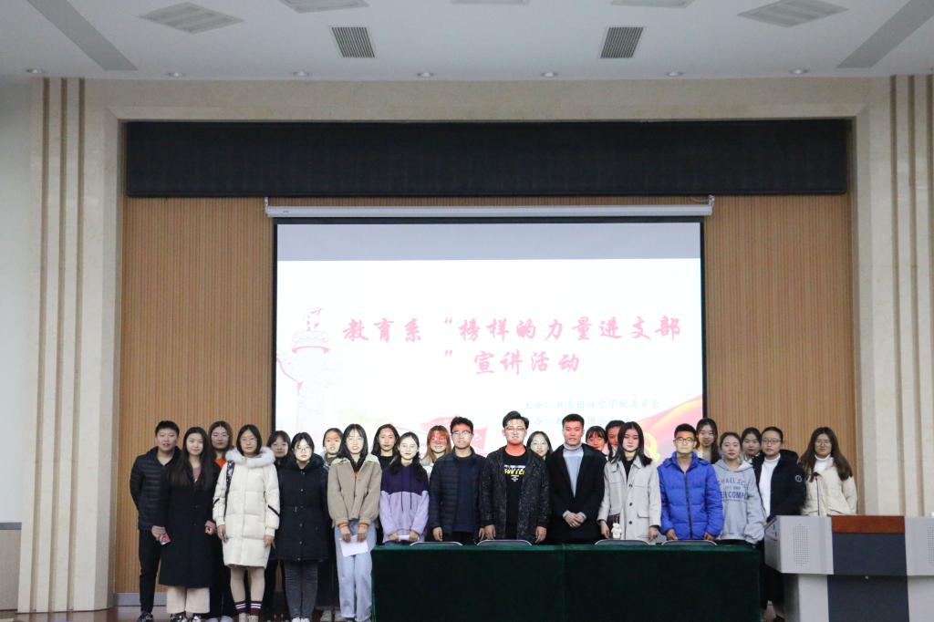 20191120日晚,由共青团济宁学院委员会主办,教育系团总支承办的榜样的力量大学生成长成才宣讲会在3号楼报告厅举行,教育系学生会代表以及2019级新生代表参加了宣讲会。