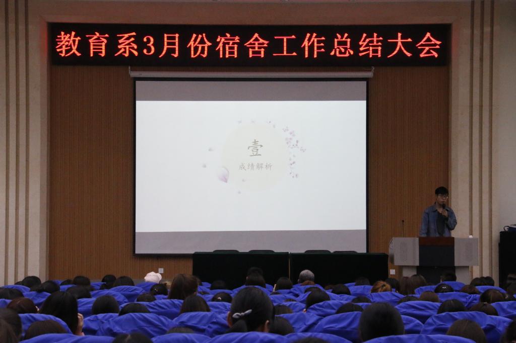 首先,由2018届宿管部副部长王叶清同学对教育系各级各个专业的宿舍进行了全面的分析,让同学们更加直观的了解到3月份宿舍优秀率情况。随后,刘勇老师进一步对宿舍工作的情况进行了分析并指出存在的问题,针对这些问题提出了对未来宿舍工作的期望,并对各位领导老师同学的付出表示由衷的感谢。在会上,刘老师还特别指出,学生会成员以及班干部要以身作则,起到带头作用。最后,通过多媒体对优秀宿舍进行图片展示,希望大家改进不足之处,取得更好的成绩。