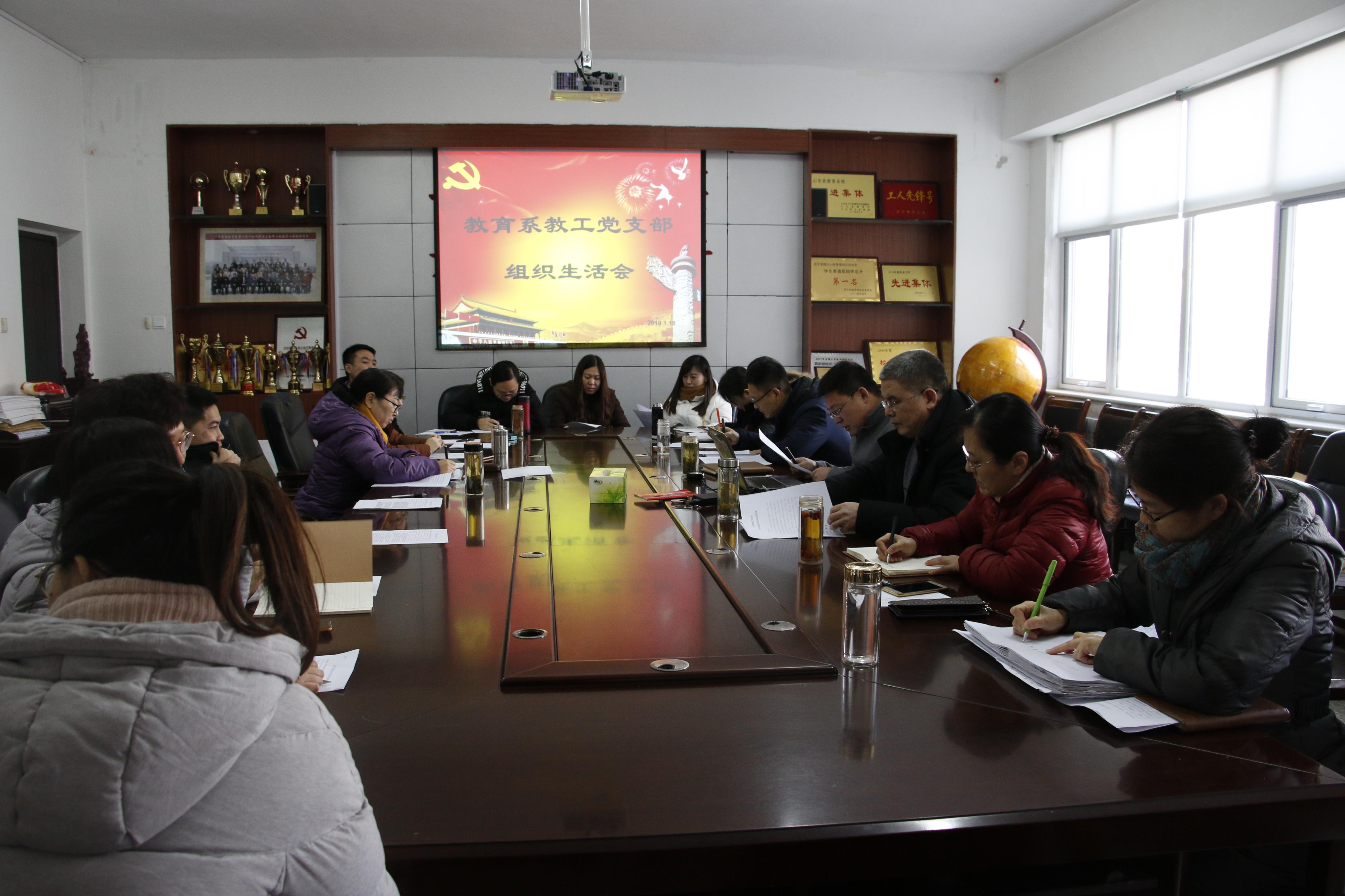 2019年1月18日上午9点,教育系教工党支部在文科楼A211召开组织生活会。党总支书记乔东华、系主任李群、365英国上市(集团)公司副院长曹光海、副主任单清清以普通党员身份参加生活会,会议由教工党支部书记刘勇主持。