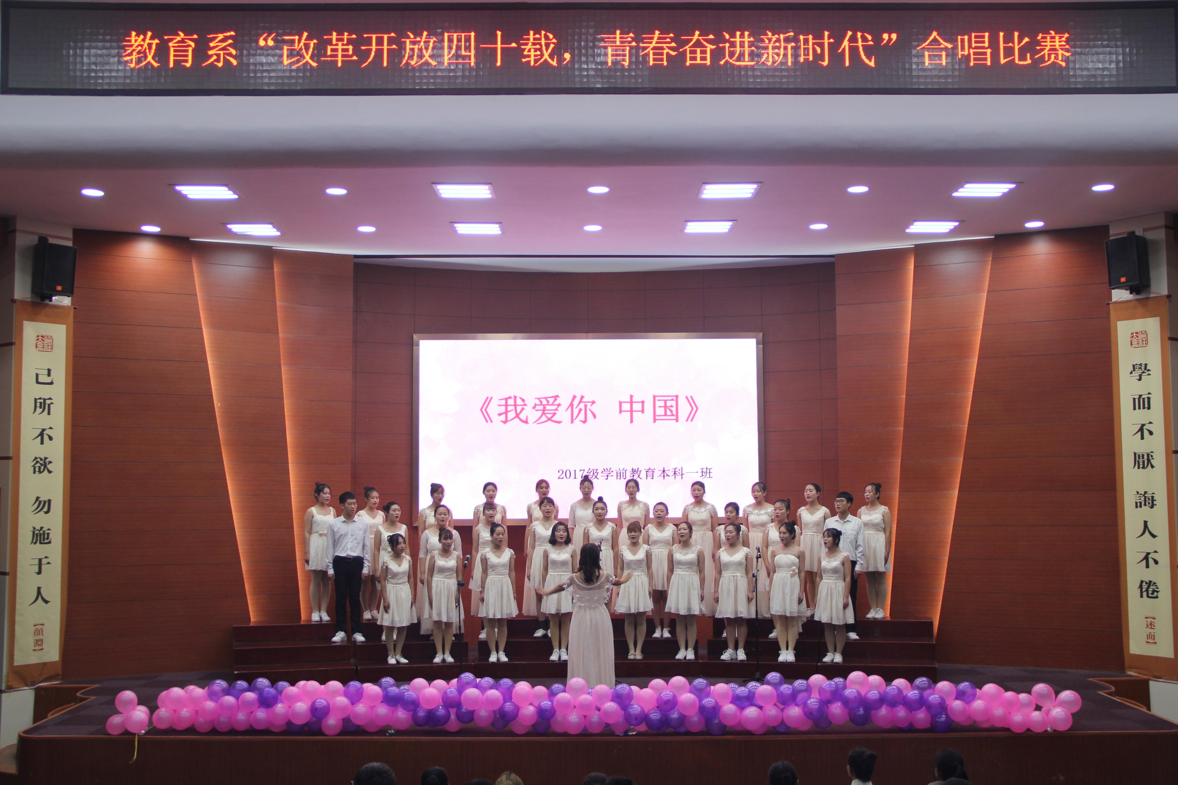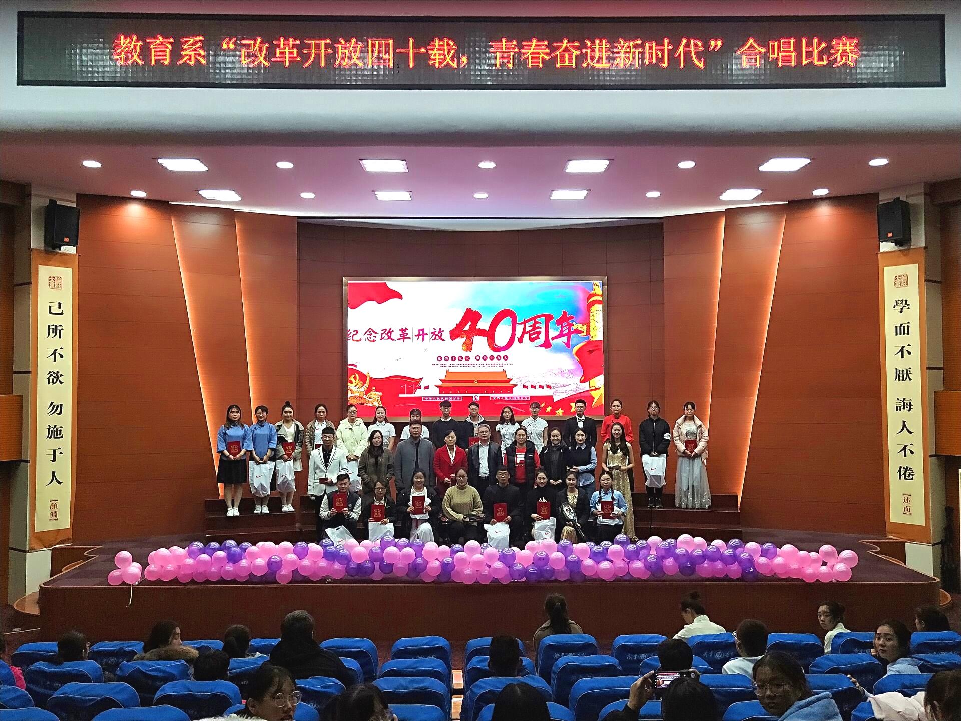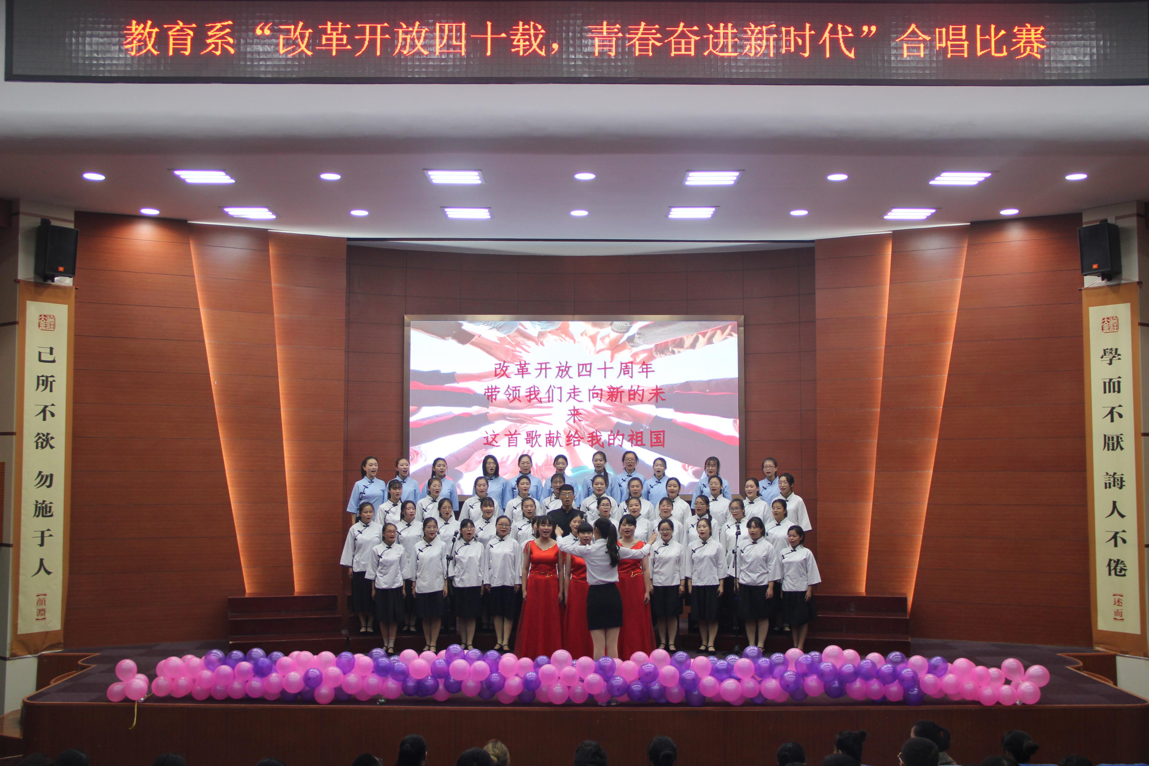 2018年11月15日下午4时,教育系在理科楼报告厅举办了以"改革开放四十载,青春奋进新时代"为主题的合唱比赛。教育系党总支书记乔东华、主任李群、党总支副书记刘勇等老师观看了本次比赛。