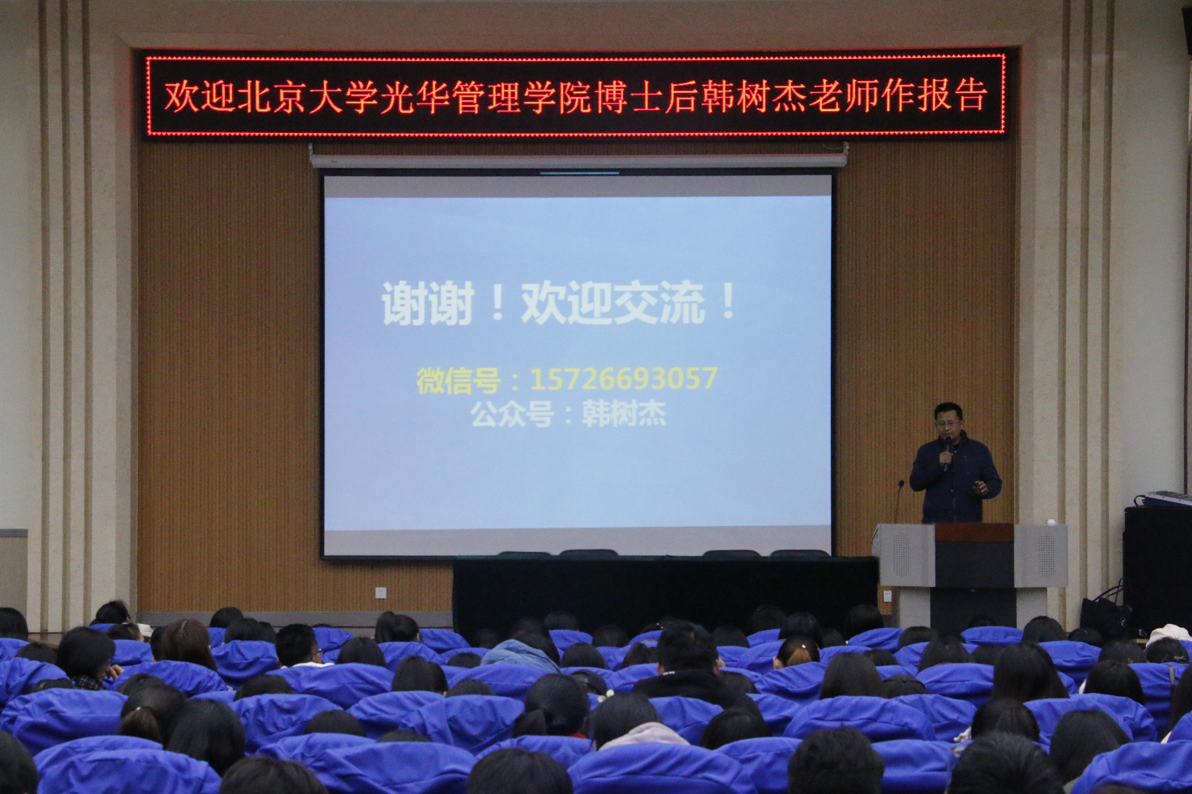 报告会上, 韩树杰博士以图片的形式向大家展示了“创业中国四十年”的成果,详细论述了不同的社会阶段涌现出不同的创业特点。随后,韩老师重点阐释了创新思维、创业技术与艺术创业模式的理念,着重强调了创新创业是一种人生态度和生活方式,并引导同学们思考创新创业的核心问题。韩老师结合自身多年实践经验以及作为中国“互联网+”大学生创新创业大赛总决赛评委的经历,就如何释放创造性潜能,由想法到现实,给大家作了精彩分享。