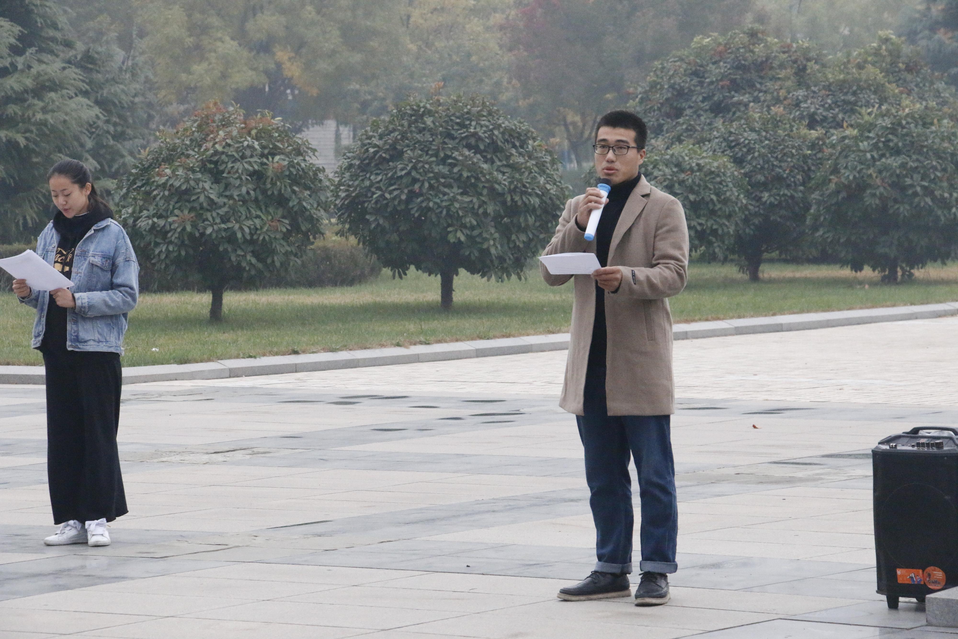 伴随着激昂的《义勇军进行曲》,五星红旗在同学们的注目礼中冉冉升起。随后,学生代表孟庆鑫以《我们的大学应该奋斗》为主题进行了国旗下的讲话,激励同学们不忘初心,希望同学们继续发扬艰苦奋斗的精神,担当得起新时代大学生的神圣使命。最后,由邵一鸣同学提出倡议:作为新时代的大学生,应该时刻牢记改革开放历史,坚定信念,要大胆试、大胆实践!同学们从慷慨激昂的演讲中感受到作为共青团员的使命和责任。