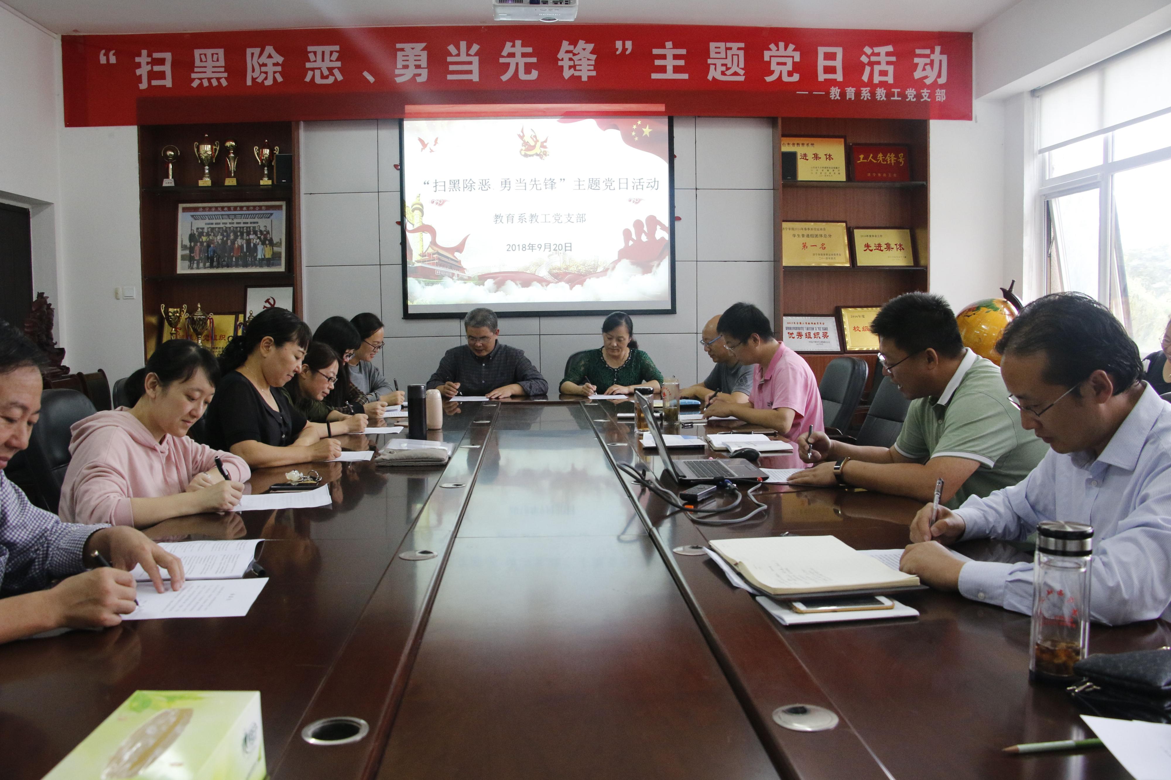 根据《济宁学院关于开展“扫黑除恶、勇当先锋”主题党日活动的通知》要求,9月20日下午,教育系教工党支部开展了“扫黑除恶、勇当先锋”主题党日活动。本次活动由教工党支部书记刘勇主持,全体教工党员出席会议。