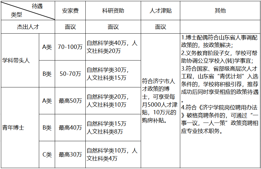 (3)人才配偶的工作情况符合上级有关规定的,可办理配偶随调,无法随调的,可按劳务派遣用工方式安置校内工作。根据济宁市政府相关人才政策可协调帮助解决子女入学。