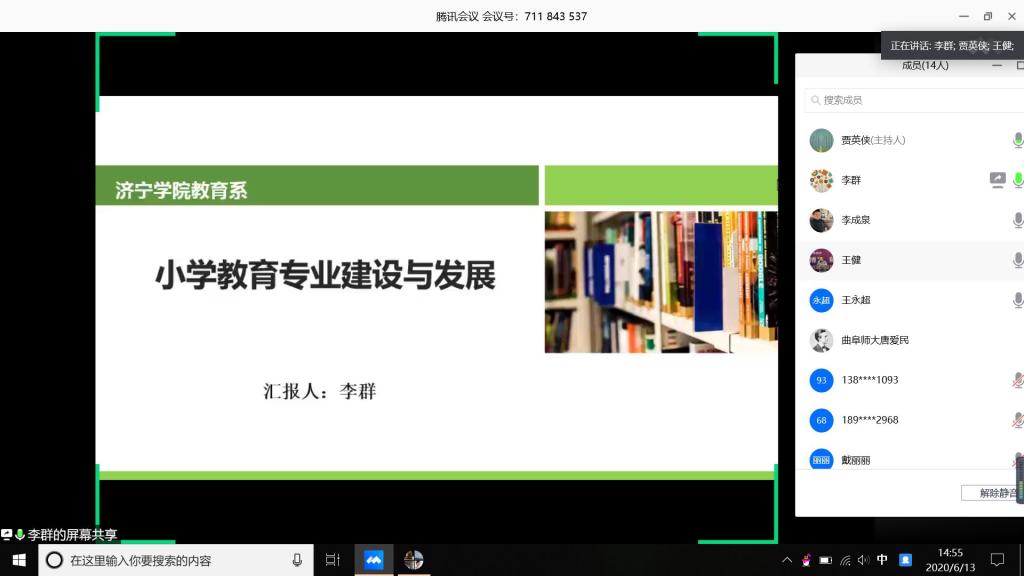 为了提高我校小学教育专业建设水平,提升人才培养质量,2020年6月13日下午,济宁学院小学教育专业建设指导委员会借助腾讯会议平台,采用线上线下相结合的形式,召开了济宁学院小学教育建设研讨会。曲阜师范大学教育科学学院院长唐爱民教授、临沂大学社会科学处处长李中国教授、上海师范大学教育学院初等教育学系主任王健副教授、济宁学院附属小学钱广书校长、济宁学院第二附属小学李成泉校长、曲阜市春秋小学袁正新校长、济宁学院教务处李传银处长、教育系李群主任、数学系王绍锋主任、中文系王永超主任、教务处张邦伟副处长和教育学教研室部分老师参加了会议,会议由教育系副主任贾英侠主持。