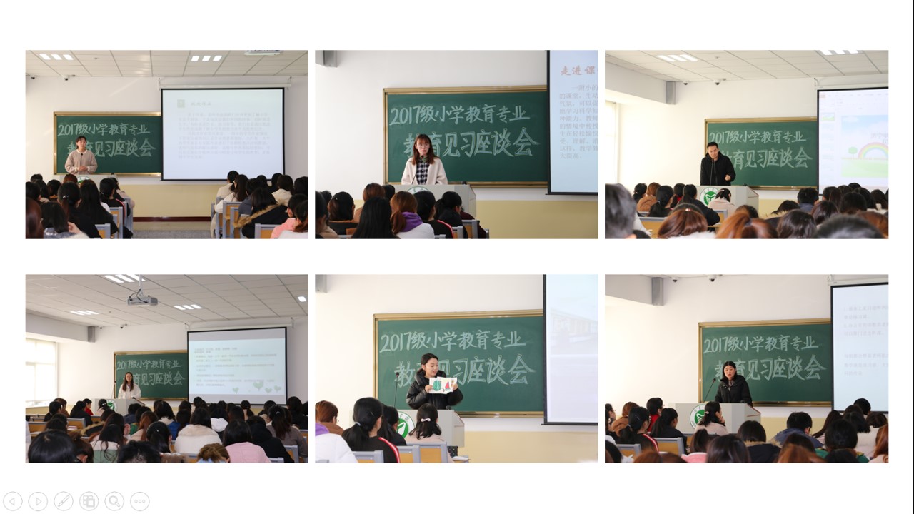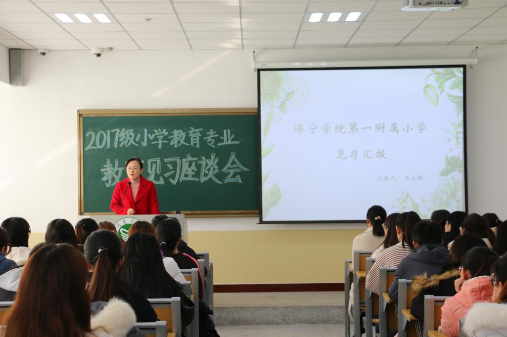 然后,2017级小学教育专业的王小梅、张至贤、李鹏飞、张景浩、王璐瑶、赵银桂作为代表对济宁学院附属小学、第二附属小学、曲阜春秋小学三所小学6个小组的教育见习情况进行了汇报交流,内容主要包括在小学的听课、评课、协助老师批改作业、参与班级管理与班级文化建设等工作情况以及教育见习期间的收获和心得体会。