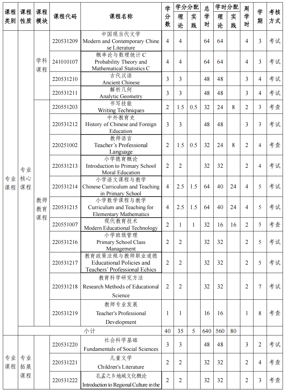专业基础课程:大学语文、高等数学、现代汉语、线性代数、小学教育专业导论、普通心理学、教育原理、儿童发展心理学、课程与教学论、教育心理学。