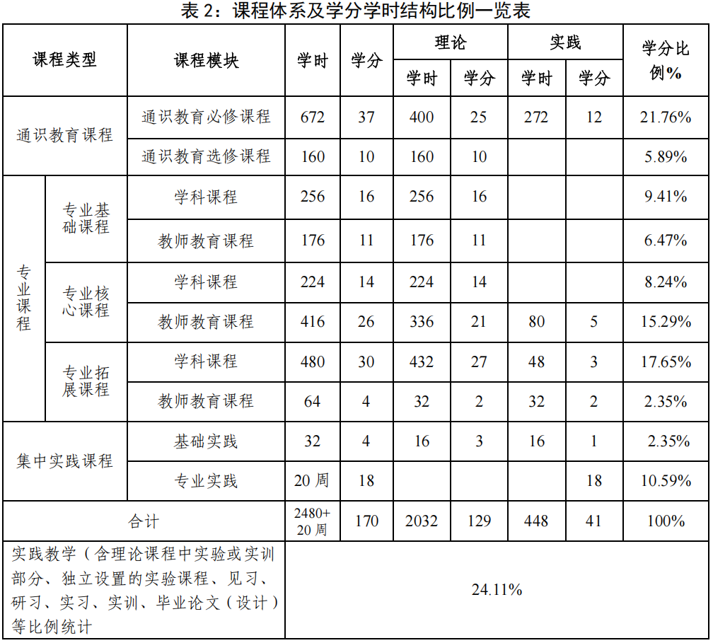 五、课程体系及学分学时结构比例一览表