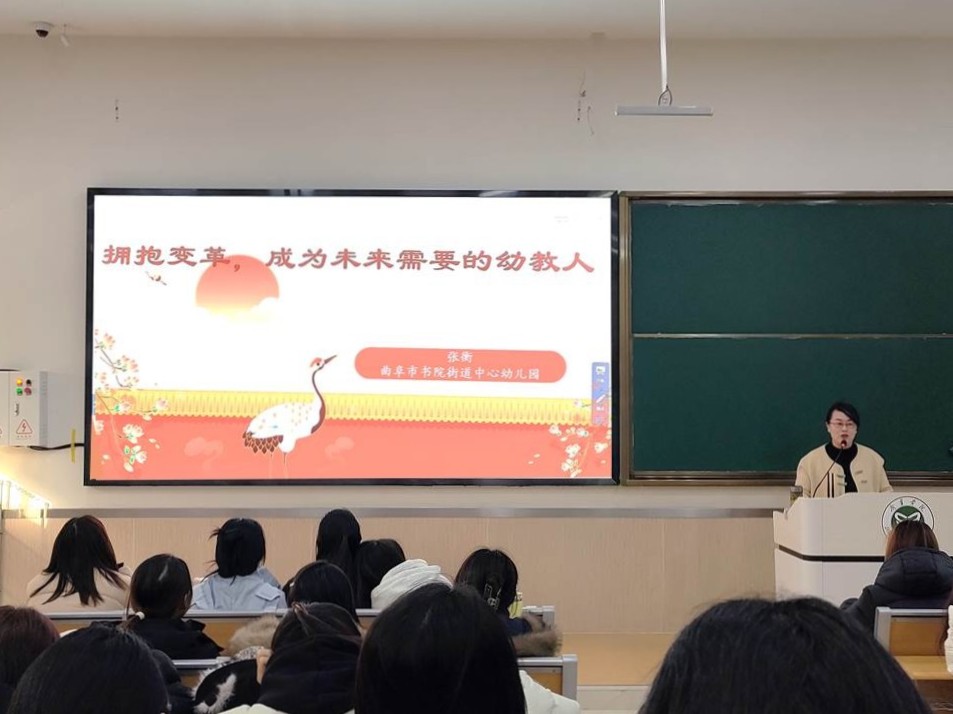 张衡从新时代幼儿教师面临的实际挑战出发,结合自身多年的办园与管理经验,通过一系列真实生动的教育案例,深入浅出地阐释了幼儿园教师工作的独特性和专业性,以及幼儿教师如何在一线工作中具体践行教育家精神、涵养深厚的职业情怀。针对学生们普遍关心的当前形势下幼儿园教师的职业发展问题,张衡系统梳理了从幼儿园新手教师到卓越教师的成长路径,围绕“如何胜任未来高质量的学前教育工作”给予了学生们切实可行的建议。在互动环节,张衡耐心细致地回答了学生的提问,现场交流氛围热烈。