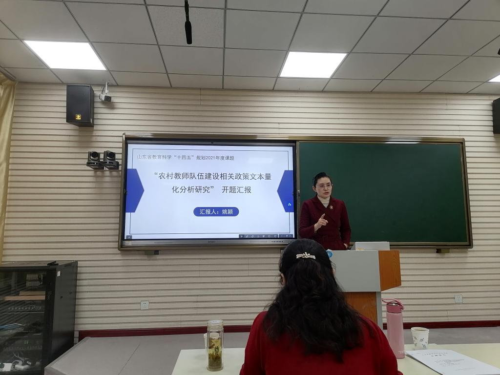 三位教师分别对自己的课题研究进行了汇报。王帅主持的“义务教育集团化办学的运行机制与创新路径研究”,郑程月主持的“乡村振兴战略下乡村小学教师精准培养的协同机制与实践策略研究”,姚颖主持的“农村教师队伍建设相关政策文本量化分析研究”,分别从问题的提出、研究框架、研究方法、研究重点难点、组织分工和预期成果等方面进行了汇报。