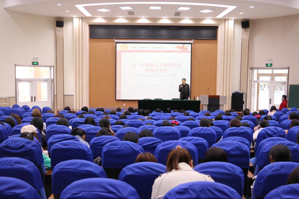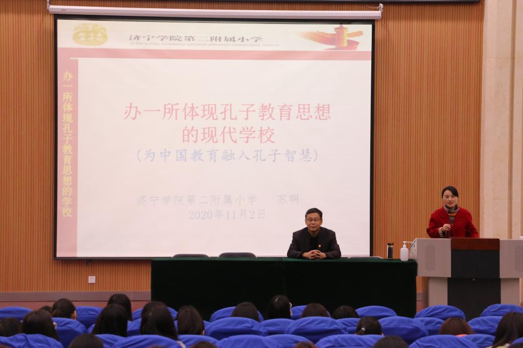 苏明校长从三个方面展开讲座,第一部分介绍济宁学院第二附属小学的百年历程及发展探索,阐释了“办一所体现孔子教育思想的现代学校”这一办学理念确立的缘由及价值;第二部分介绍了孔子教育思想融入学校教育的六大途径,指出要将孔子教育思想融入学校文化、课程改革、班级管理、学生生活、教师发展并充分利用好社会、家乡资源,打造“传统文化进校园十大行动”;第三部分展示了济宁学院第二附属小学独具特色的“少年君子”传统文化教育活动,让学生直观感受了二附小浓厚的儒雅之风。