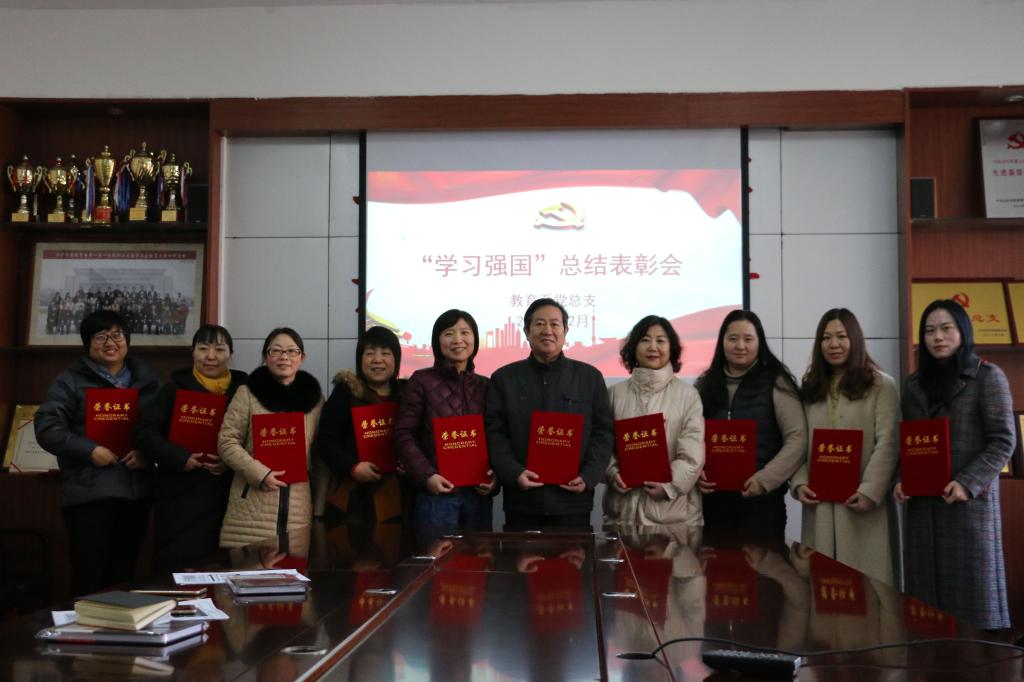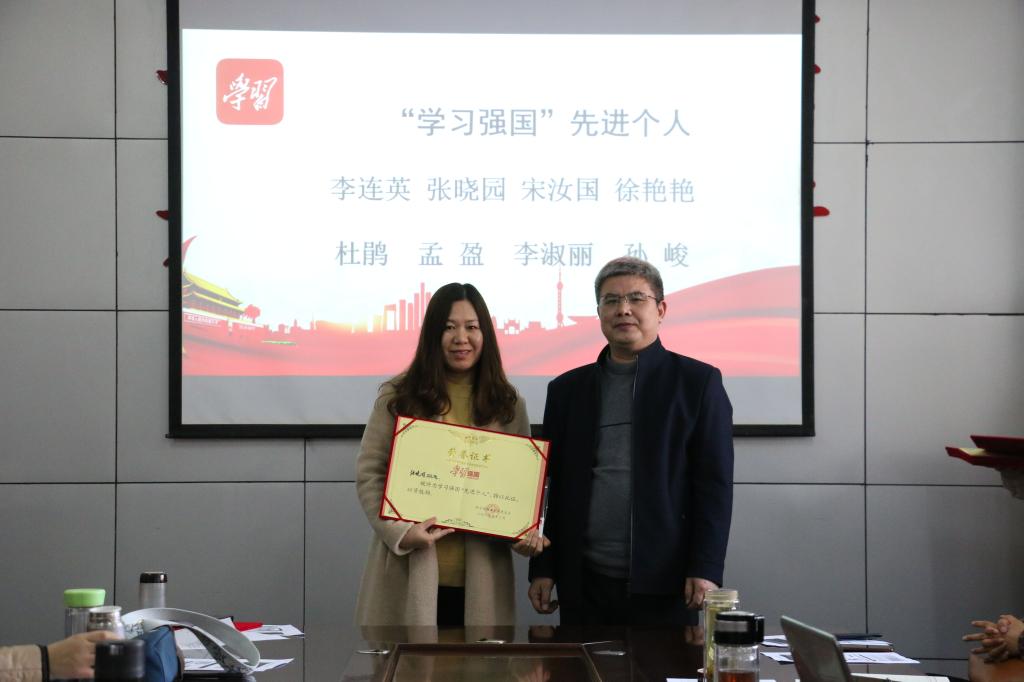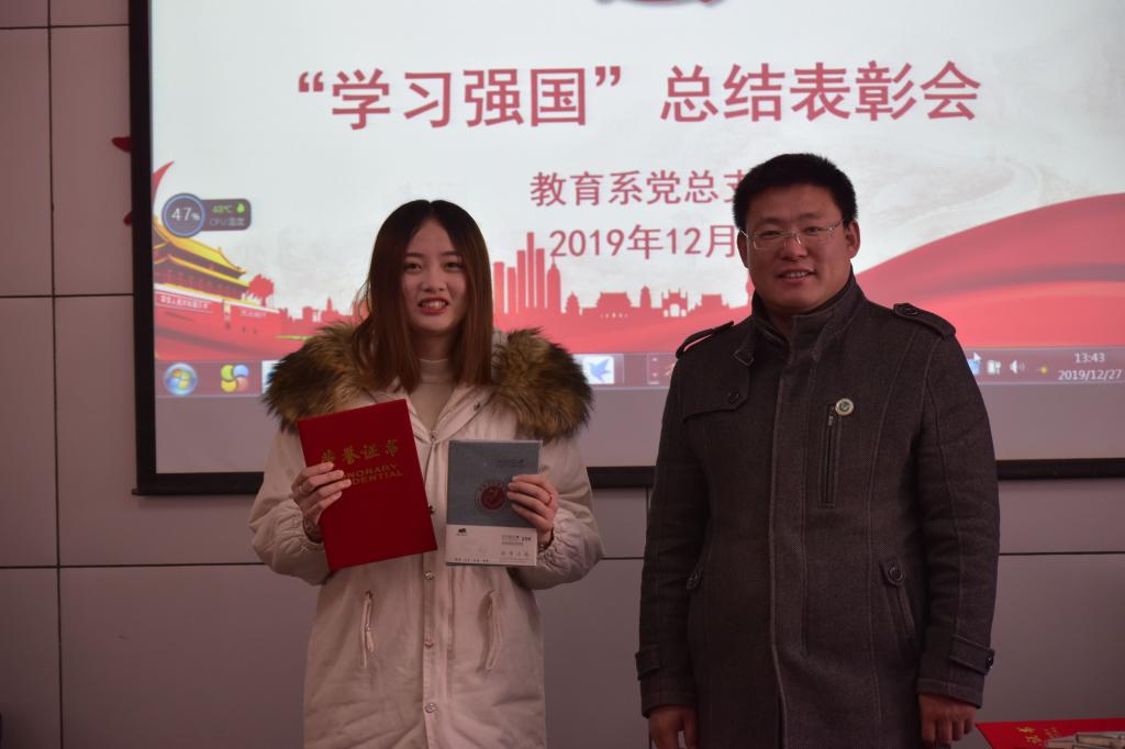 会上,系党总支书记乔东华对一年来我系参与“学习强国”平台学习的总体情况进行了分析总结,用“三高”来充分肯定了我系2019年在学习强国平台学习中所取得的成绩:党员100%的参与率、100%的活跃率和4510000分以上的高分率。在充分肯定成绩的同时,也指出了存在的问题和不足,希望大家在反思总结的基础上,进一步提高学习的自觉性和实效性,把学习贯彻习近平新时代中国特色社会主义思想作为首要政治任务,在学懂弄通做实上下功夫,推动学习贯彻不断往深里走、往心里走、往实里走。随后,对李连英等8名党员教师和陶委等5名非党教师以及宗丽等23名学生党员、入党积极分子予以表彰,授予他们教育系“学习强国先进个人”荣誉称号,乔东华书记和李群主任分别为他们颁发荣誉证书和奖品。