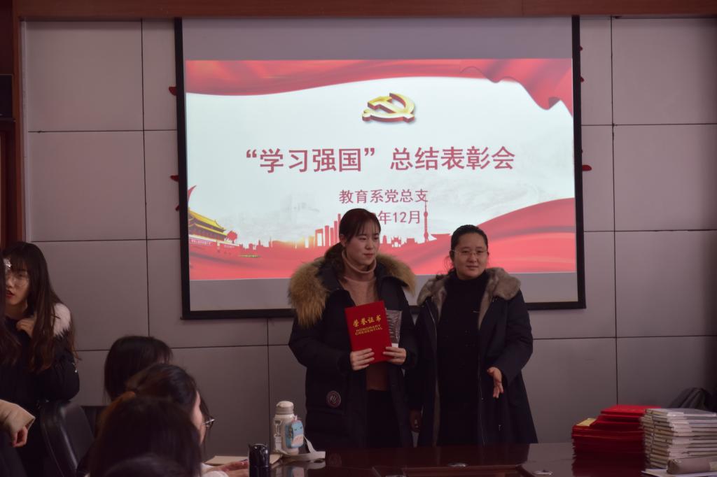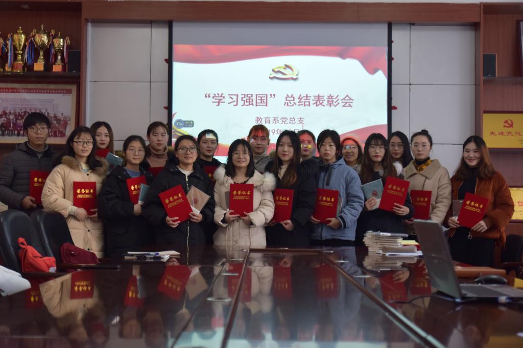 为进一步推动“学习强国”学习平台推广使用工作,巩固前期学习成果,激发大家持续学习的热情,1226日,教育系在系会议室召开“学习强国”先进个人表彰大会,对2019年在学习强国平台学习中表现突出的先进分子予以表彰。系全体教师和学生党员、入党积极分子参加了此次会议。