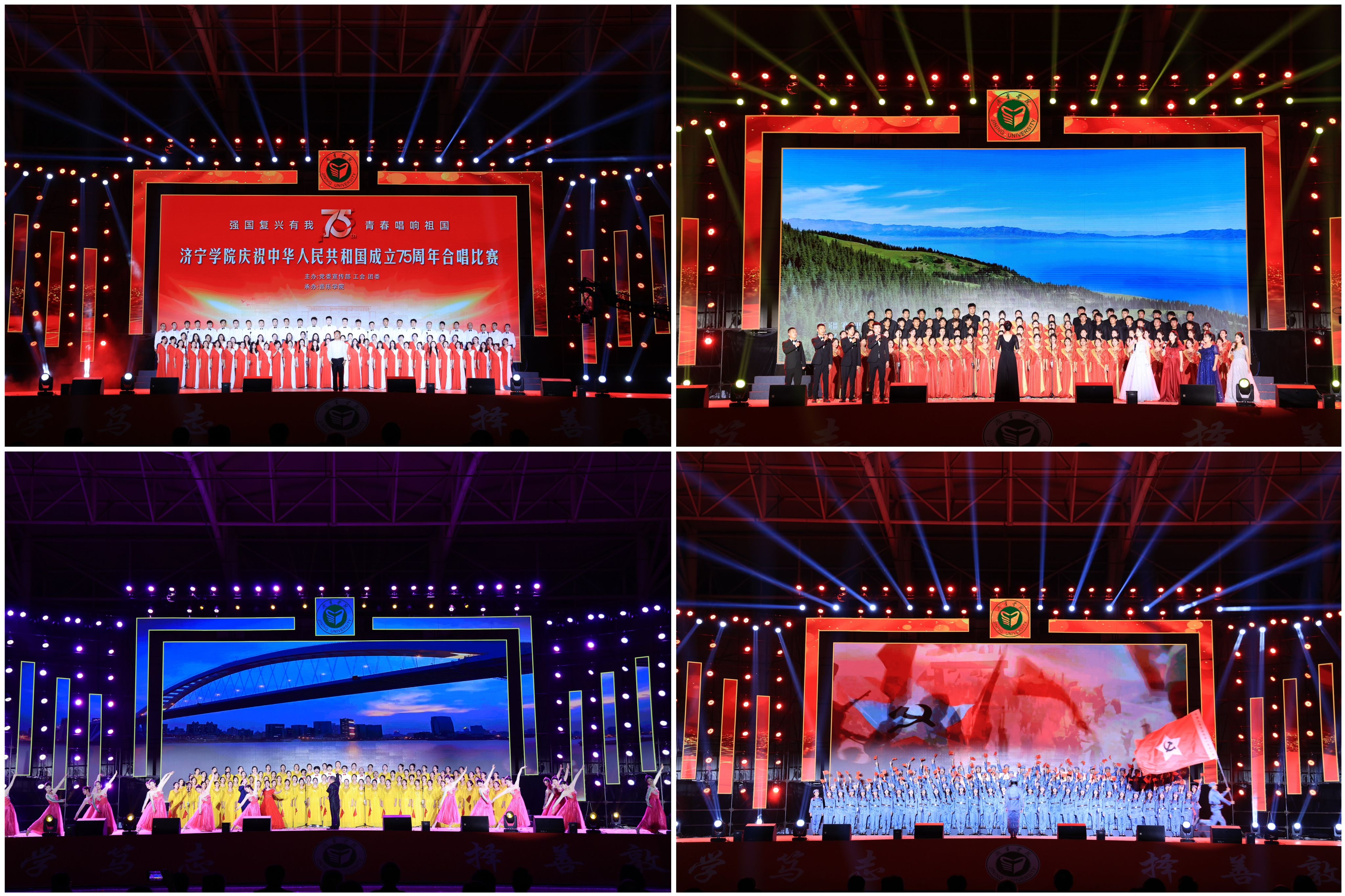 歌颂伟大的祖国,致敬辉煌的中国共产党,一曲曲爱国红歌铿锵有力。各参赛队伍紧紧围绕爱国主题选取歌曲,以饱满的热情、嘹亮动人的歌声,吟唱着难忘的光辉岁月,新颖的编排、磅礴的气势展现了新时代济园师生昂扬向上的精神风貌。教师合唱团的《共筑中国梦》纵情高歌,用嘹亮的歌声重温往昔峥嵘岁月,拉开了这场音乐盛会的序幕;大美经管合唱团的《十送红军》深情回顾了那段艰苦卓绝的革命岁月,传递出对红军英魂的无限敬意;“艺术青年”合唱团的《不忘初心》如同一面旗帜,飘扬在观众心中,唤起了大家对初心的思考与坚守;文乐之声合唱团、“智创机电”合唱团与煊燃青春合唱团带来的《歌唱祖国》唱响了新时代的旋律,唱出了对祖国母亲的爱;超越律动合唱团的《少年中国说》激励着青年一代勇于迎接挑战,以青春之名创青春之国家;“乐之声合唱团”以优秀的专业素养向我们展示了《新时代之歌》的精神内涵;IT新青年合唱团的《我爱你中国》充满了希望与力量,坚韧又富有诗意;物电红歌和颂团的《祖国不会忘记》,表达出了新时代青年勇于奋斗、甘于奉献的精神内核;数行天下合唱团与沸点音符合唱团的《红旗飘飘》承载了中华儿女对五星红旗的热爱与崇敬,表达了作为华夏儿女的骄傲与自豪;心飞扬合唱团的《在灿烂阳光下》体现了与时俱进、不忘初心的新时代精神;“声”如夏花“音”你绽放合唱团的《送别》深刻表达出了在离别时的情感与感悟;寓心合唱团的《看山看水看中国》唱出了大江大河给予中华民族的澎湃力量,看祖国春风荡漾,展青春绚丽风采;“春之声”合唱团的《祝福祖国》展现了对祖国的美好祝愿;星光合唱团的《祖国不会忘记》歌声嘹亮,动人心魄,营造了弘扬主旋律、唱响正气歌的浓厚氛围;四季合唱团的《同一首歌》表达了在面对困难时要怀揣希望,永不气馁。最后比赛在济宁学院大学生艺术合唱团带来的《灯火里的中国》的优美歌声中结束。下一步,学校将继续组织更多形式多样、内容丰富的文化活动,不断加强校园文化建设,丰富师生精神文化生活,以实际行动向祖国75周年华诞献礼。