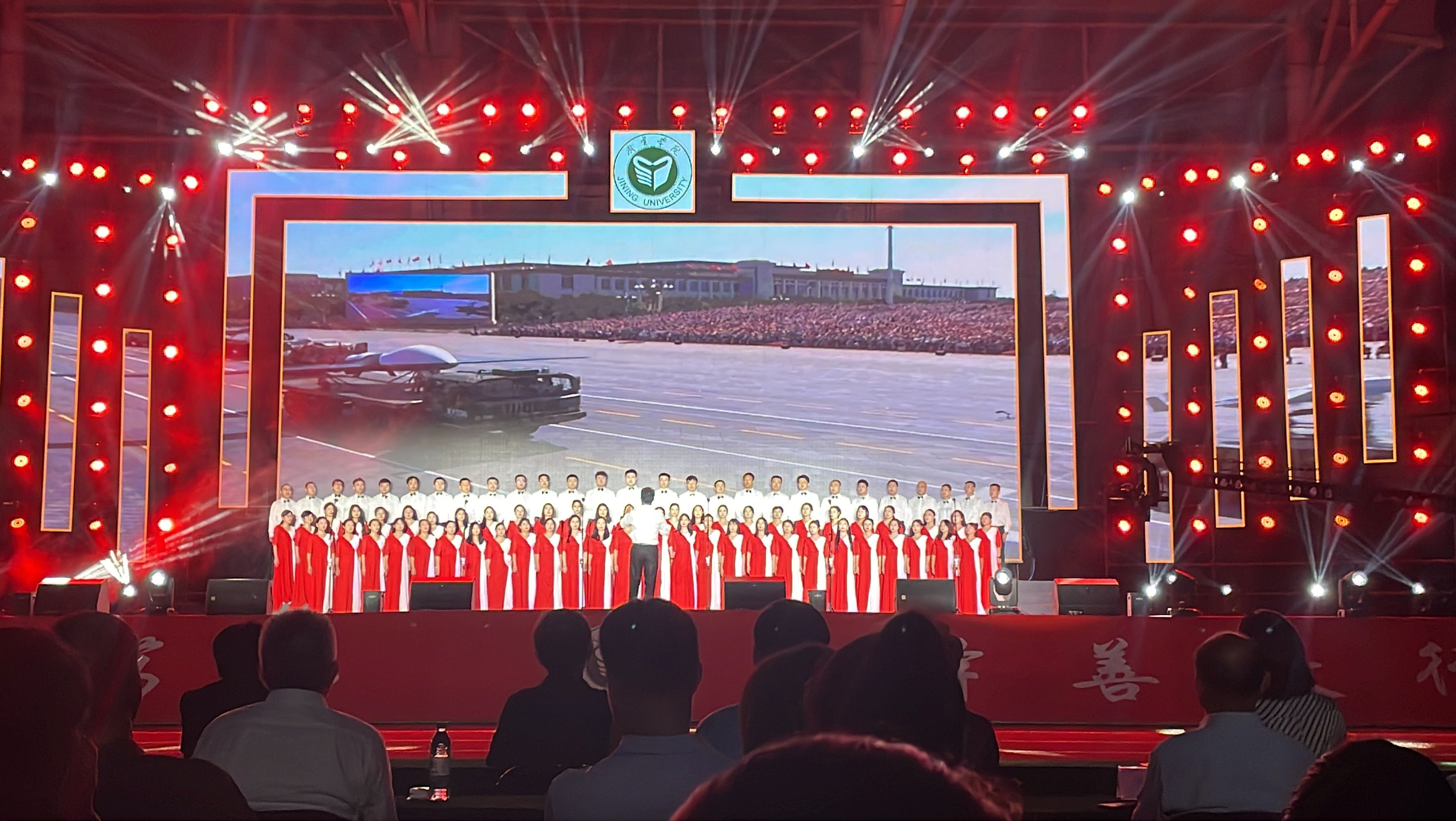 为庆祝中华人民共和国成立75周年,大力弘扬爱国主义精神,唱响时代主旋律,9月29日晚,由校党委宣传部、工会、团委主办,音乐学院承办的“强国复兴有我·青春唱响祖国”济宁学院庆祝中华人民共和国成立75周年师生合唱比赛在西操场隆重举办,来自各学院的16支合唱队参加了比赛,教师合唱团、音乐学院“乐之声合唱团”、济宁学院大学生艺术合唱团作为表演团队进行展示。校党委书记杨天梅,党委副书记、校长王清明及全体在家校领导李凡路、尹春光、孔繁润、刘国栋、张永强、刘克非莅临现场观看比赛并为获奖参赛队颁奖。学校相关职能部门负责人,各二级学院主要负责人、团委书记与3000余名学生一起在现场观看了比赛。