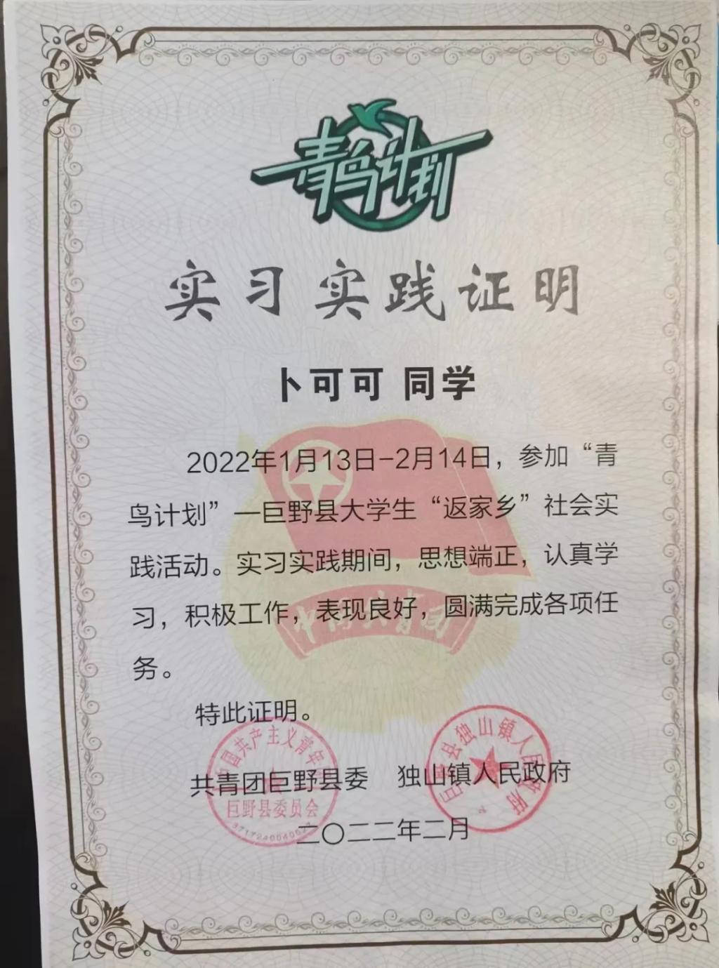 除了日常学习,各种校园活动和社会实践也是大学生活的一部分。2021年寒假,我有幸通过青鸟计划“返家乡”活动参与到家乡(菏泽市巨野县独山镇)政府的社会实践活动中,从中体验到了基层干部最真实的工作状态。在此期间,我协助工作人员做好了疫情期间四大类药品购买情况的调查,拨通电话重复着相同的话语,“您好!这里是独山镇疫情防控指挥部,您是否于X月X日在XXX药店购买过X药品”;跟随爱心人士走访希望小屋,感受人间温暖;做好春节期间禁燃禁放宣传,为家乡环境献一份力……一个月的经历,让我收获颇丰,也荣获济宁学院“优秀实践个人”称号。