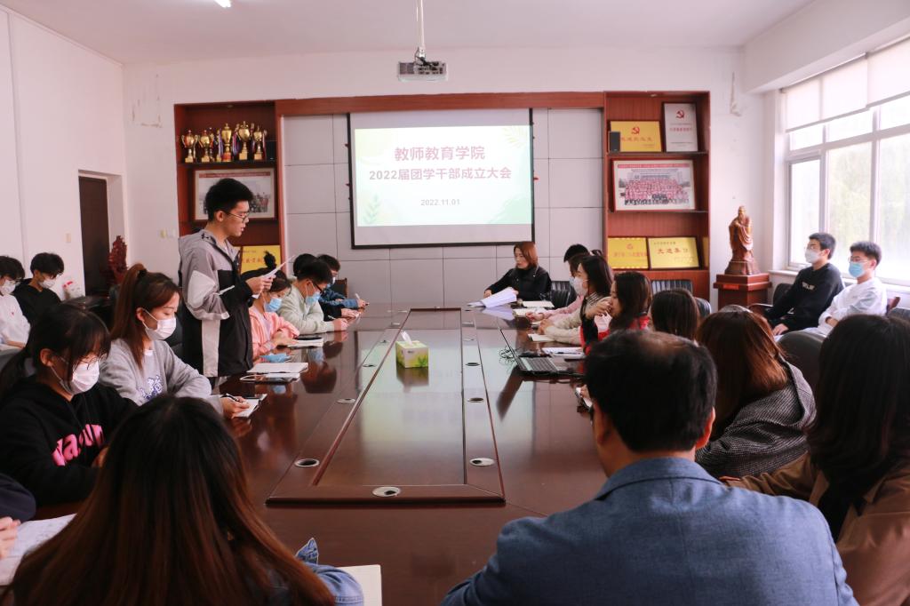 本次换届经过前期宣传动员,同学们踊跃报名,共有60余名学生干事参与换届面试。经过面试竞选、无记名投票、集体讨论商议,最终确定张子俊等45名学生为新一届团学干部。在新一届团学干部成立大会上,2021届学生会代表赵元琪分享了自己的工作心得与体会,并对2022届团学干部送上真挚的祝愿。张子俊等新一届团学干部逐一发言,表达对未来一年工作的憧憬和决心。该院团委书记杜鹃从大局意识、执行力、创新等方面对2022届团学干部提出了要求与期待,希望每位成员增强团队意识,加强自我学习,做到各方面均衡发展。