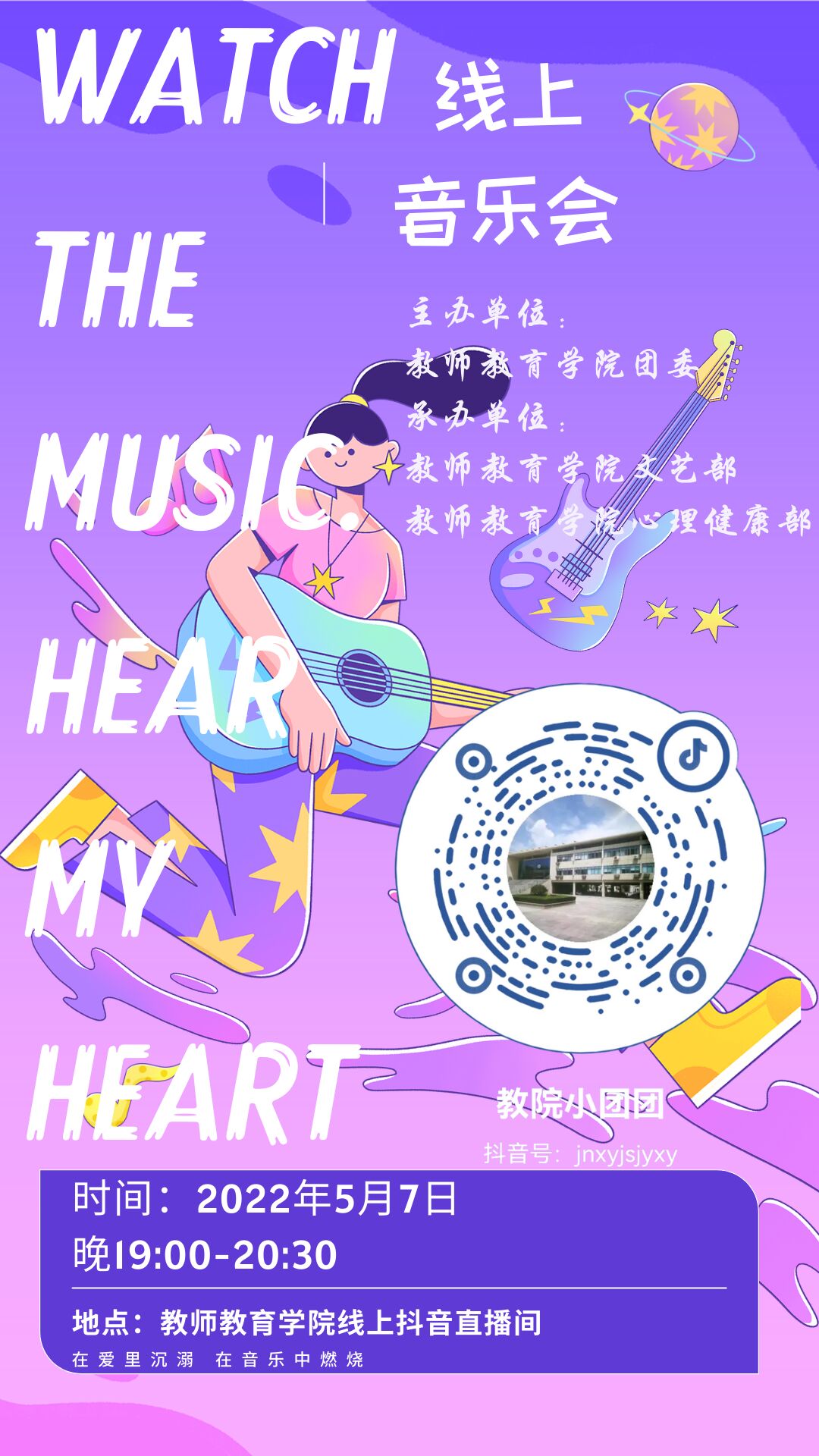 为丰富疫情防控封校期间校园文化生活,舒缓师生紧张的学习生活状态,鼓舞大家共克时艰、携手战“疫”,5月7日晚,365英国上市(集团)公司举办“Watch the music.Hear my heart”线上音乐会活动,用歌声传递温暖,为师生送上了一场“美育”盛宴。