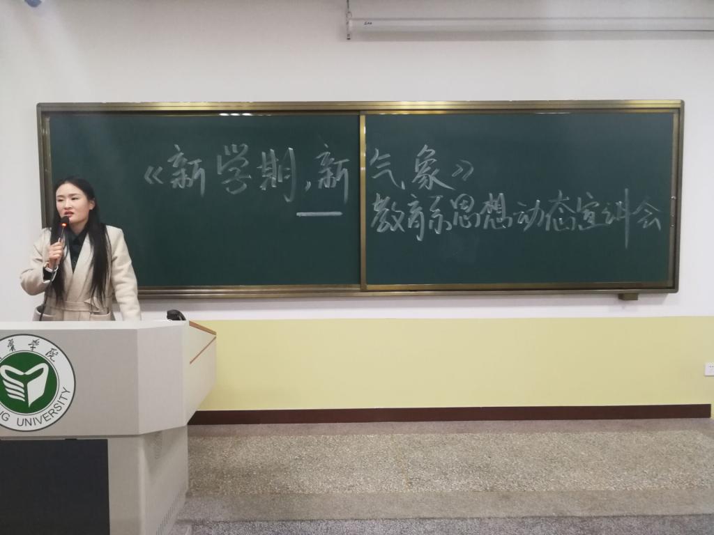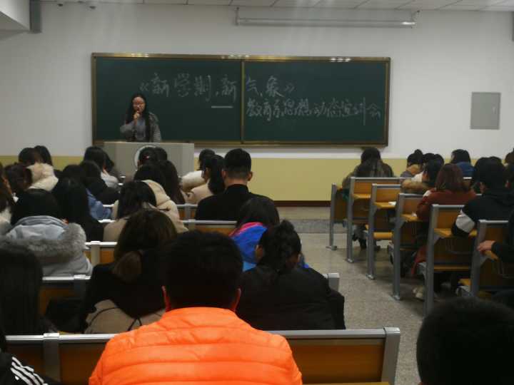 新的学期又将是一段崭新的航程,为加强班级在新学期里的学风建设、增强班级凝聚力,教育系于3月4日晚六点半在A206举行了“新学期、新气象”思想动态宣讲会,本次会议由田翠老师担任主讲,同学认真学习了本次宣讲会内容,在同学间引起了积极的反响。