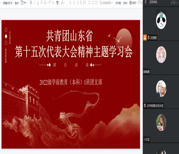 学习会上,学生干部们认真学习了共青团十八届七中全会精神、学习共青团山东省第十五次代表大会报告。共青团十八届七中全会强调,要紧紧围绕学习宣传贯彻党的二十大精神主题主线,团结引领广大团员青年永远跟党走、奋进新征程、建功新时代,组织动员青年围绕党的二十大战略部署担当作为、贡献力量,为全面建设社会主义现代化国家、全面推进中华民族伟大复兴而团结奋斗。共青团山东省第十五次代表大会是在全省上下深入学习宣传贯彻党的二十大精神、奋力开创新时代社会主义现代化强省建设新局面的关键时期召开的一次青春盛会,深入学习贯彻习近平总书记关于青年工作的重要思想,紧紧围绕党的二十大提出的目标任务和山东省委作出的“走在前、开新局”战略部署,找准工作切入点、结合点、着力点,争取在为党育人、服务大局、服务青年、自我革命等方面有更大作为。