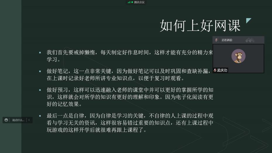 活动通过钉钉、雨课堂、QQ视频等多种方式展开,各班学委线上向学生讲诉了有关“如何建设好校风学风”的内容,学生认真听取学委建议,进行了交流发言。之后各班以视频、表格、照片等多种形式记录班会情况并交由专业老师评选出优良学风班集体。