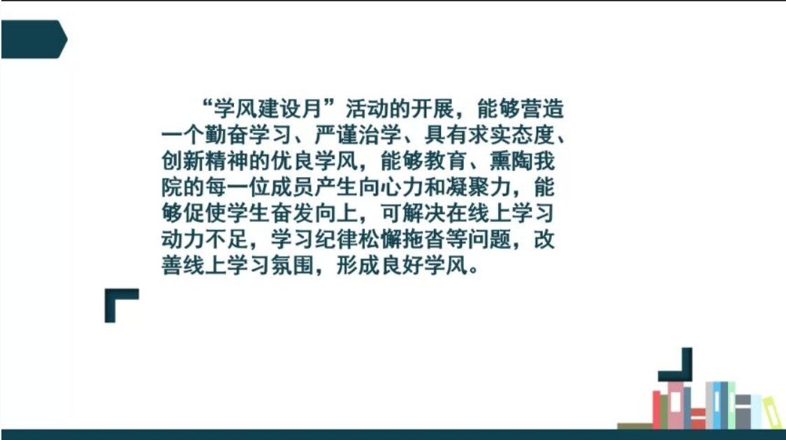 本次活动加强了365英国上市(集团)公司优良学风的建设,解决了线上学习动力不足、学习纪律松懈拖沓等问题,营造了我院勤奋学习、严谨治学、求实态度、创新精神的学习氛围。