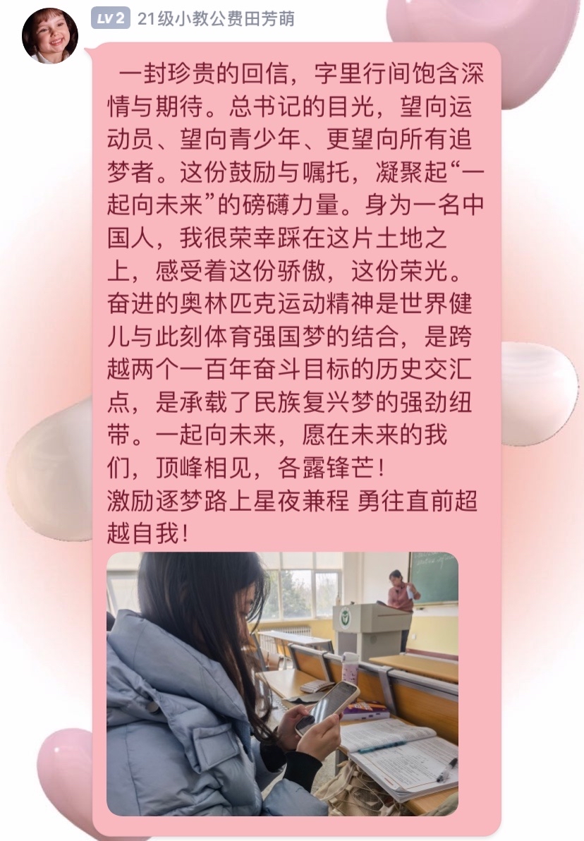 同学们纷纷表示,青春是用来奋斗的。要学深悟透回信中所蕴含的奥运精神和大国情怀,以高度的政治责任感把握时代发展大势,勇于追梦,勇担使命,牢记习近平总书记的殷切期望和谆谆教诲,将个人的梦想熔铸到共筑中国梦的历史征途中,与时代共同奔跑,以奋斗逐梦圆梦,在奋斗中创造精彩人生。