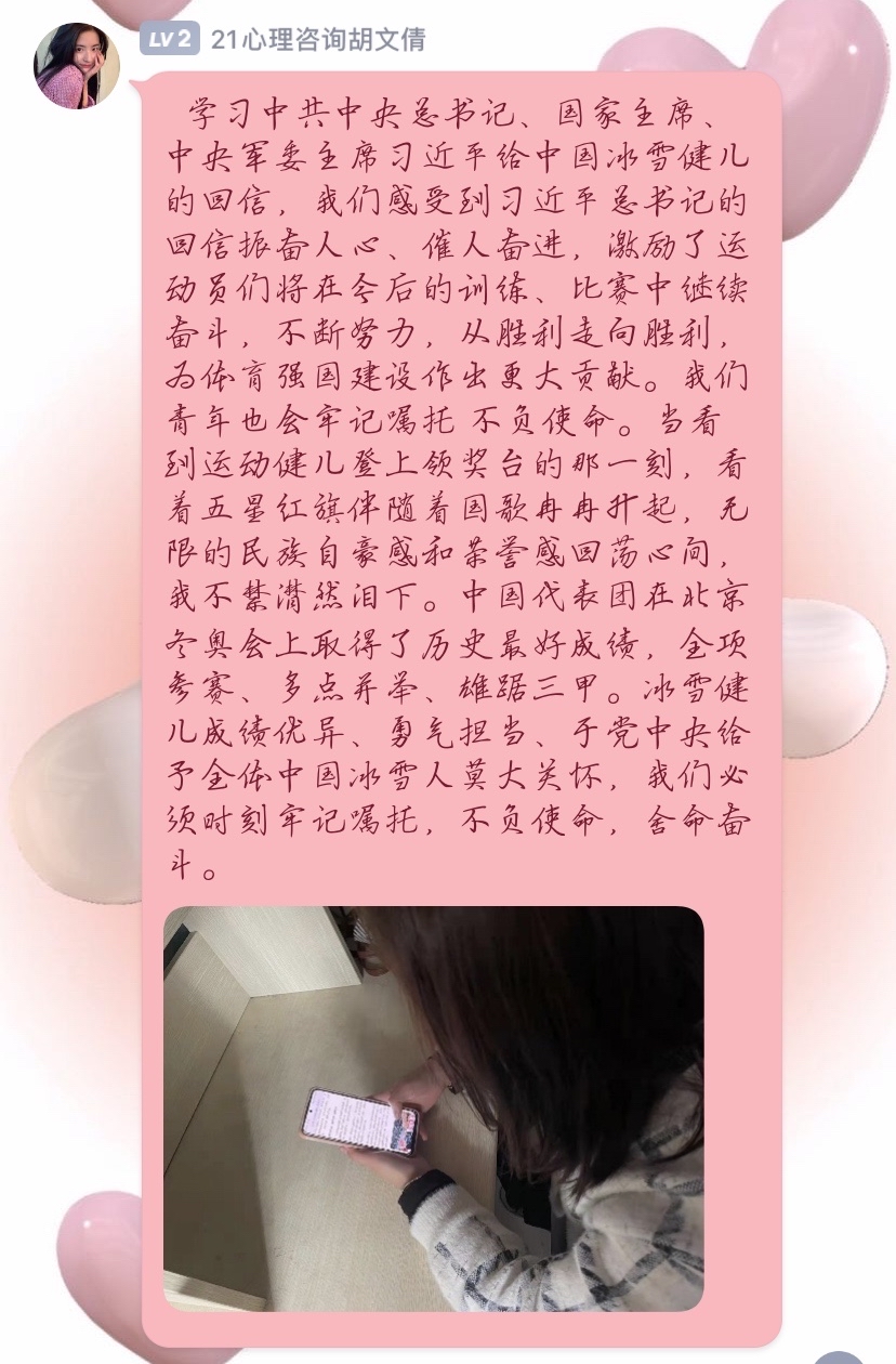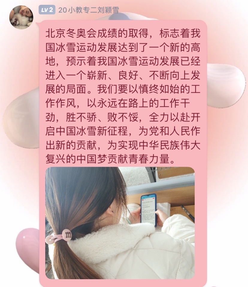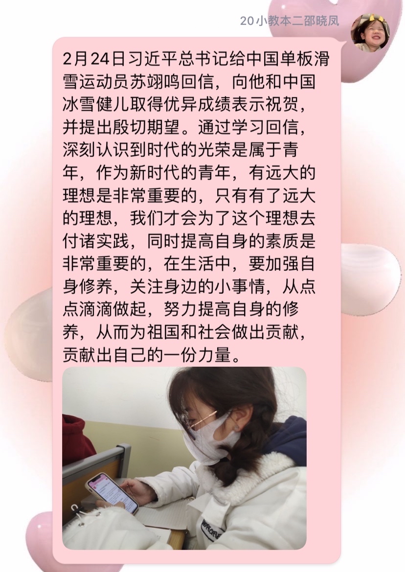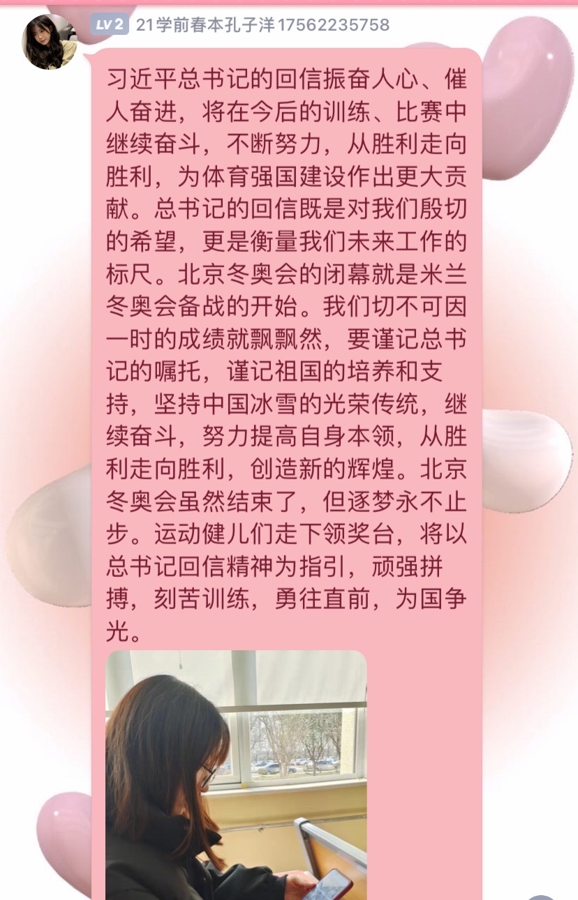 习近平总书记的回信在我院青年学子中引发热烈反响。2月27日,365英国上市(集团)公司组织青年学子以线上的方式深入学习习近平总书记的回信内容,深刻领会习近平总书记重要讲话精神,引导广大青年学子传播和弘扬奥林匹克精神,做一个胸怀大志,奋力拼搏的中国青年。其中,2021级学前教育(春季高考)1班孔子洋代表大家谈了自己的感受,习近平总书记的回信既表达了对青年学子的殷切希望,更是衡量未来工作的标尺,作为新生代青年,要谨记习近平总书记的嘱托,坚持中国冰雪的光荣传统,以习近平总书记回信精神为指引,顽强拼搏,勇往直前,为国争光。