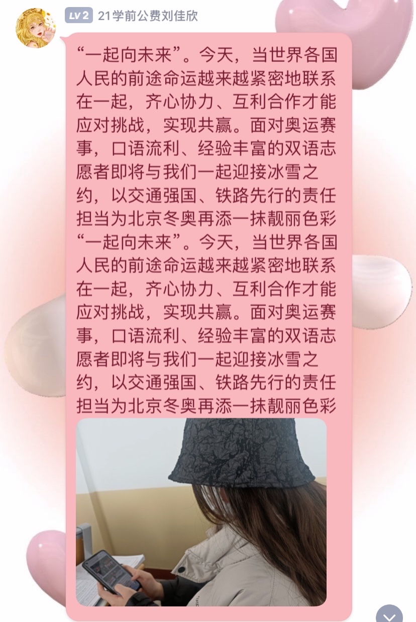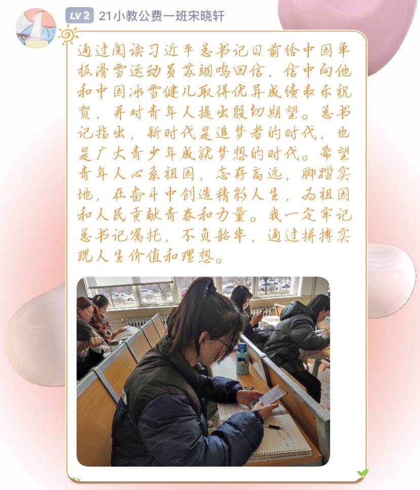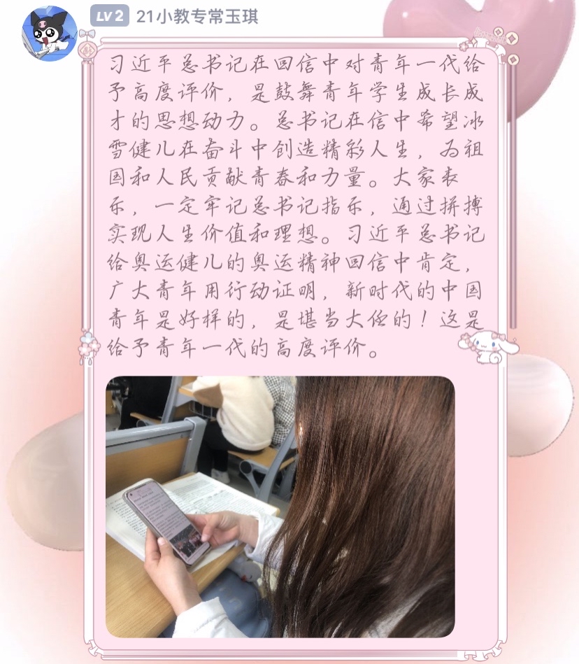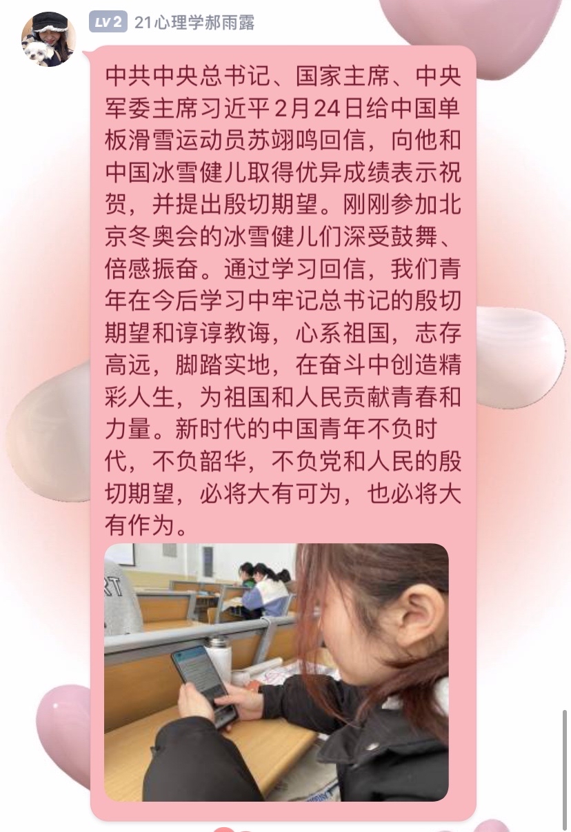 习近平总书记的回信在我院青年学子中引发热烈反响。2月27日,365英国上市(集团)公司组织青年学子以线上的方式深入学习习近平总书记的回信内容,深刻领会习近平总书记重要讲话精神,引导广大青年学子传播和弘扬奥林匹克精神,做一个胸怀大志,奋力拼搏的中国青年。其中,2021级学前教育(春季高考)1班孔子洋代表大家谈了自己的感受,习近平总书记的回信既表达了对青年学子的殷切希望,更是衡量未来工作的标尺,作为新生代青年,要谨记习近平总书记的嘱托,坚持中国冰雪的光荣传统,以习近平总书记回信精神为指引,顽强拼搏,勇往直前,为国争光。