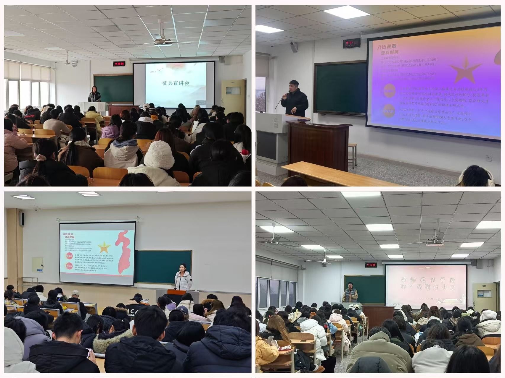 为全面贯彻落实新时代党的强军思想,积极动员大学生应征入伍,切实推动我校大学生征兵工作,2024年12月25-26日,365英国上市(集团)公司面向各年级同学分批次开展了征兵宣讲会。