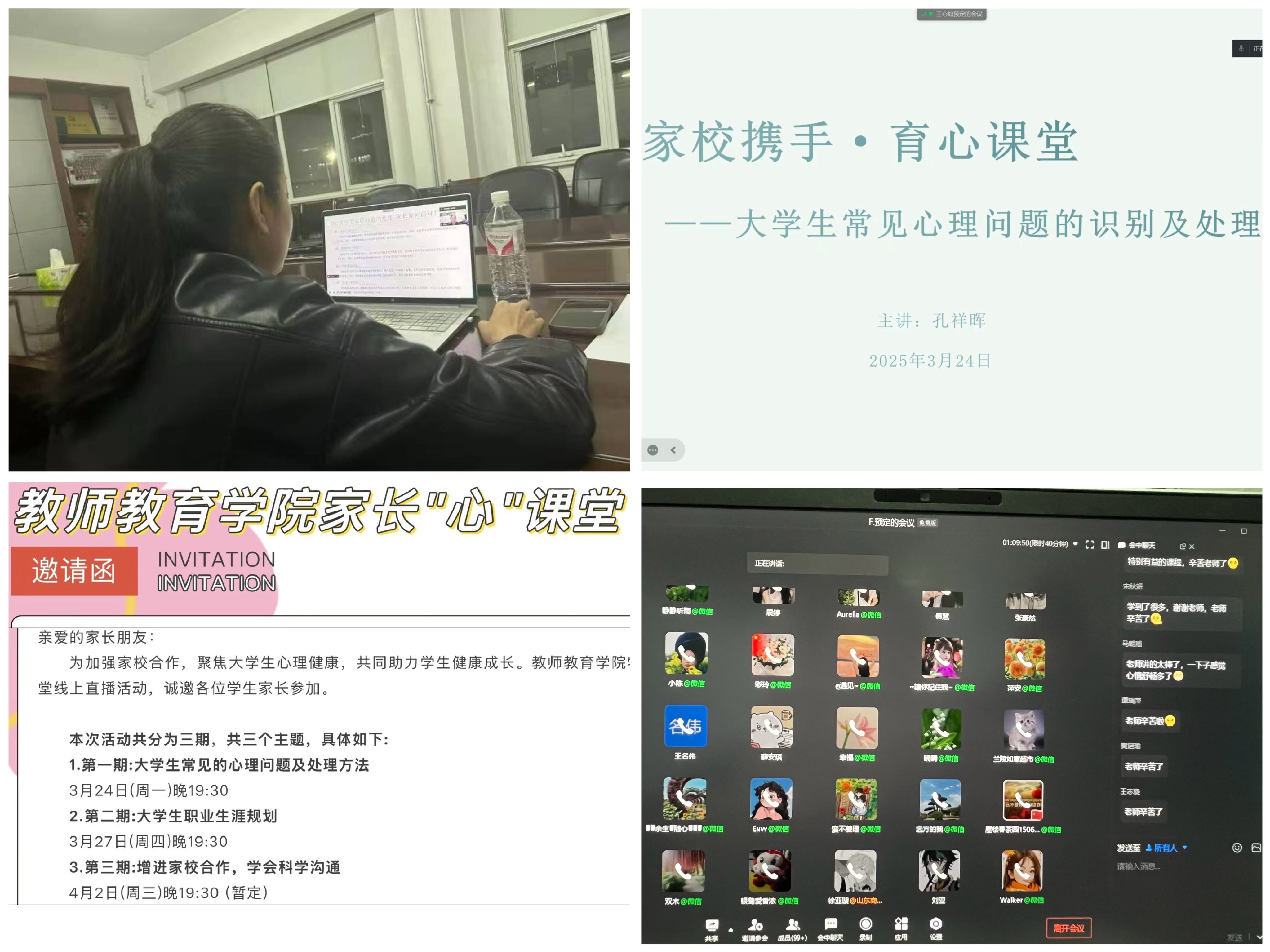 首期课程以“大学生常见心理问题识别及处理方法”为主题,辅导员孔祥晖结合一线工作经验,剖析了学业压力、人际矛盾等典型心理困扰的早期表现,通过“情绪观察三步法”等实用技巧,引导家长建立动态关注机制,并强调“理解先于指导,共情重于评判”的沟通理念。直播中,孔老师以真实案例还原心理危机干预过程,弹幕区家长纷纷表示“学会了如何做孩子的倾听者”。