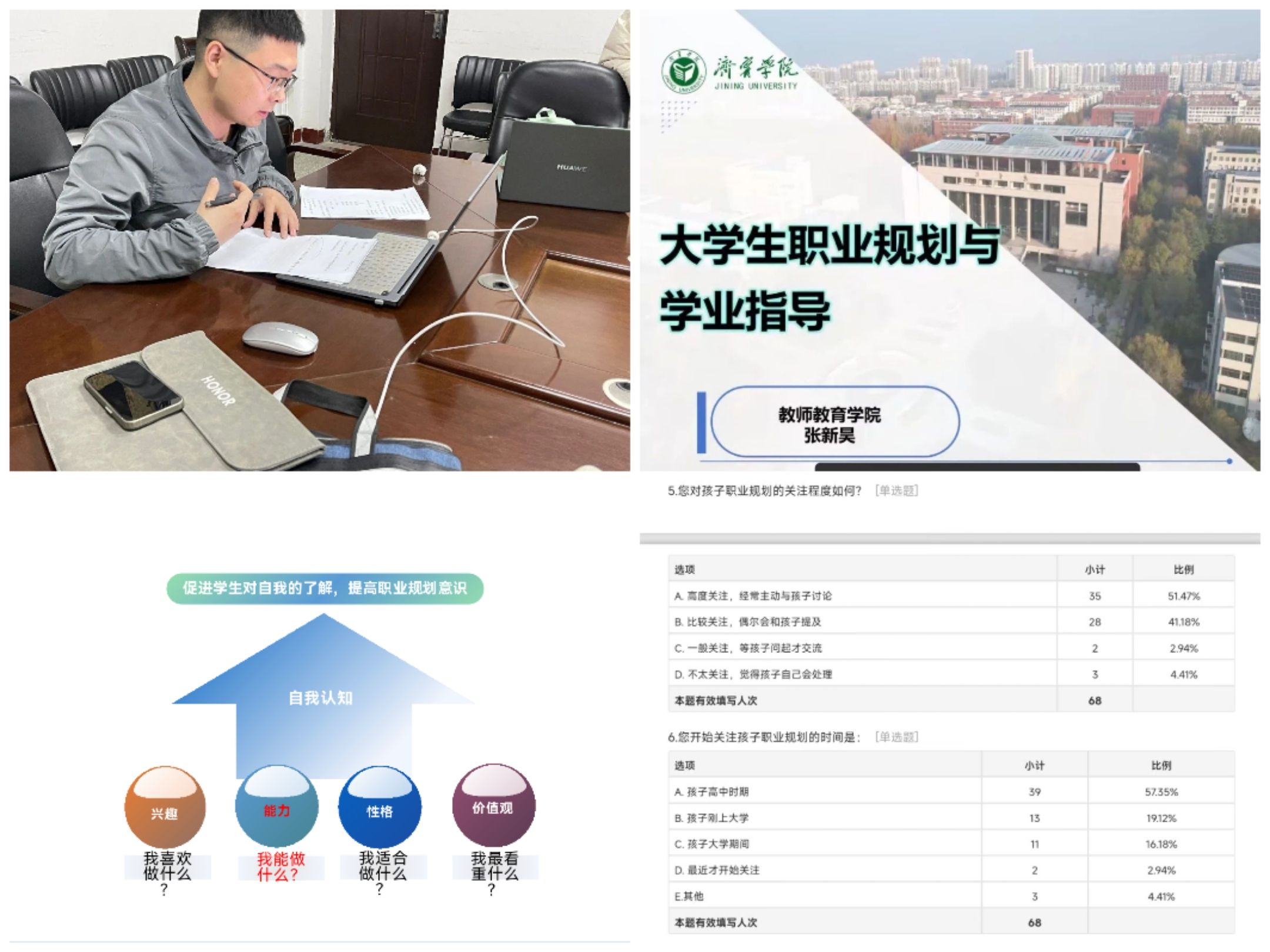 第二期课程由辅导员张新昊主讲“大学生职业生涯规划与学业指导”。他通过可视化数据展示当代大学生的就业选择趋势,演示如何利用兴趣-能力-价值”三维定位模型帮助子女制定个性化发展方案。针对家长关心的“考研还是就业”、“专业对口困境”等热点问题,张老师结合校企合作案例,建议家长“当好资源桥梁而非决策者”,助力学生实现从校园到社会的平稳过渡。