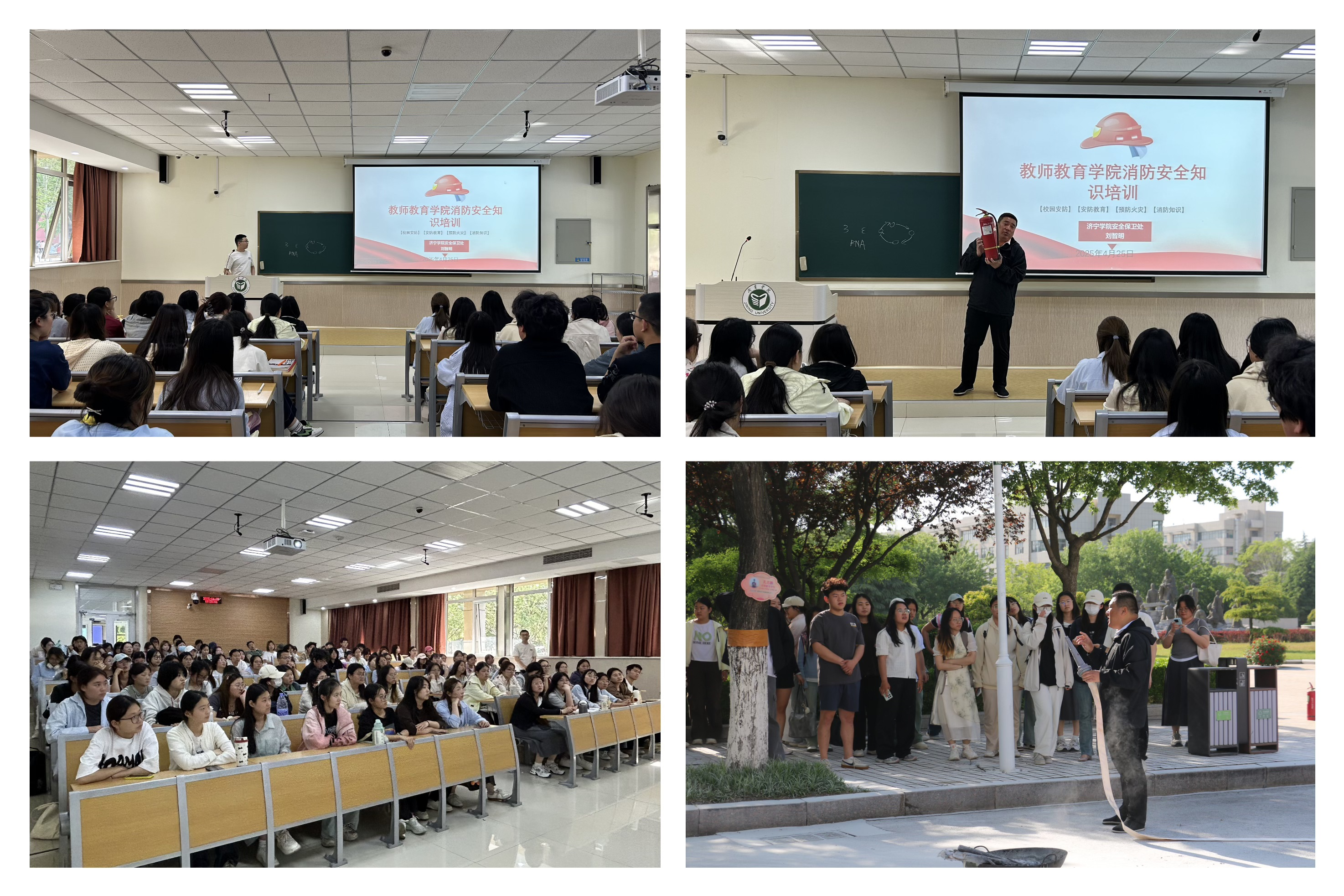 本次活动分为理论讲解和实操演练两个环节。刘智明首先开展了专题培训,通过多媒体课件详细讲解了干粉灭火器的构造原理、适用场景、"提、拔、握、压"四步操作法及消防水枪的使用方法和注意事项等专业知识。在随后的实操环节中,参训学生在专业指导下,分组进行灭火器和消防水枪的实操演练。面对模拟火源,沉着冷静,规范操作,成功完成灭火任务。