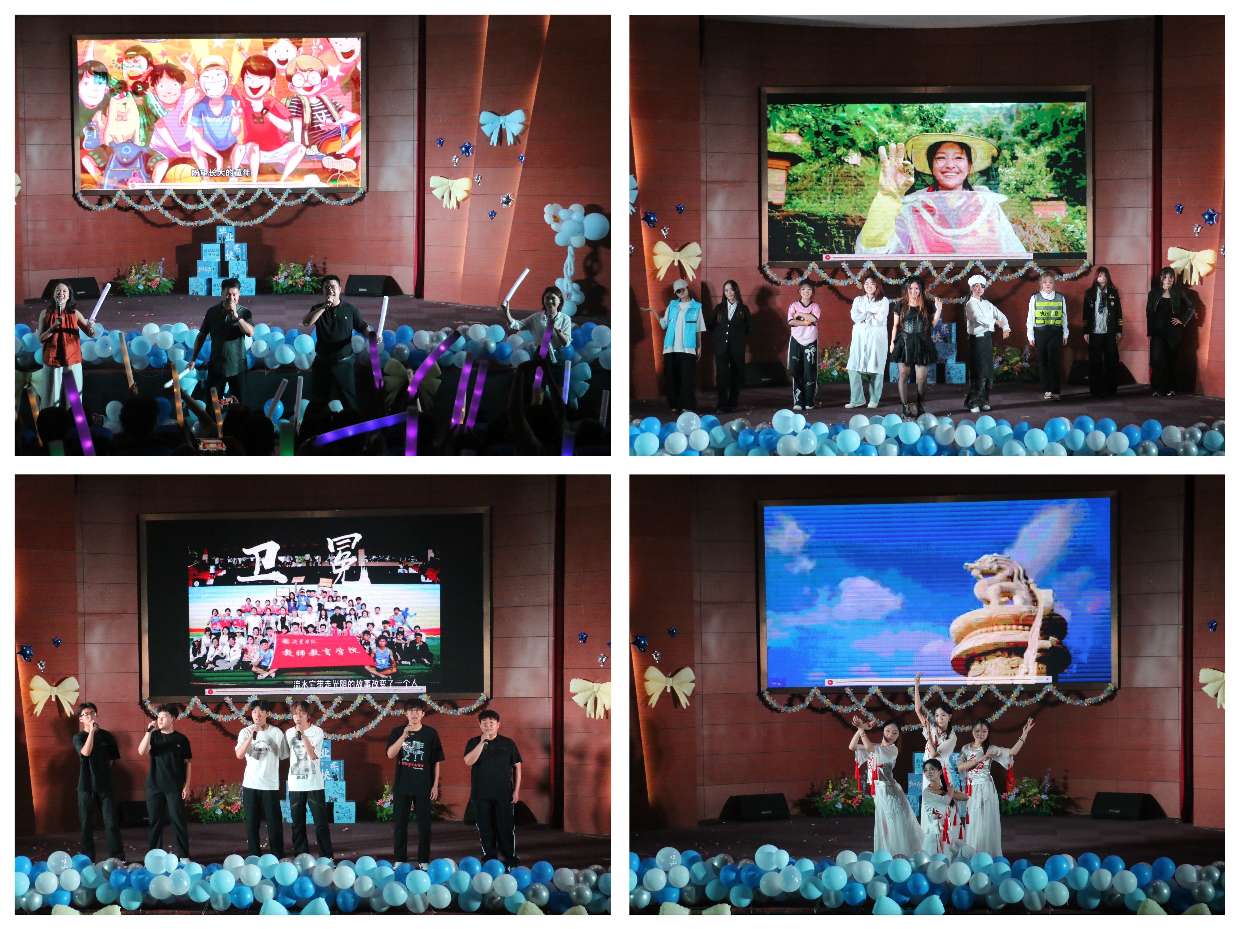 晚会分为“忆往追昔·铭初心”“青春有志·绽芳华”“砥砺奋进·向未来”三个篇章,通过歌舞、小品、器乐等多种艺术形式,展现2025届毕业生们的成长点滴和对未来的美好憧憬。活力四射的花球啦啦操为晚会拉开序幕。武术表演刚柔并济,舞出勇立潮头、矢志奋斗的豪迈气概,引发阵阵喝彩;《歌曲串烧》《光阴的故事》《最后一页》《我们的明天》接连登场,多变的曲风展现青春的多彩,从激情澎湃到温柔抒情,每一首歌都诉说着发生在杏坛路1号青春路上的故事;舞蹈《No more》《再次重逢的世界》《灯火里的中国》师生同台表演,串联起学子们的成长点滴与家国情怀;小品《青春列车》交织着往昔的欢笑与教诲,感受着师友同行的温暖情谊,承载着即将毕业的学子对母校的不舍与眷恋。晚会特邀2011级优秀毕业生常桐桐为毕业生们送上美好祝福。演出过程中还增添了游戏互动环节,将现场气氛推向高潮。