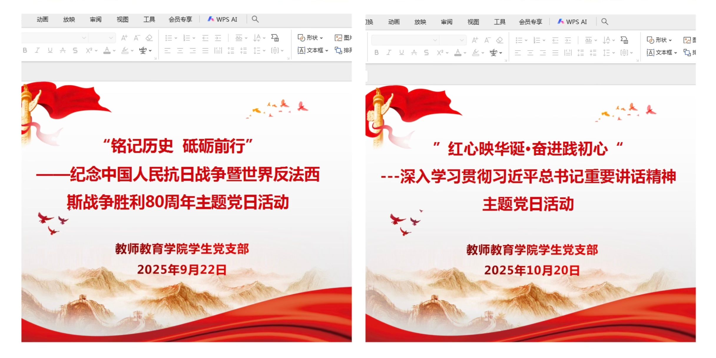 9月22日至10月20日,学院各学生党支部陆续开展“铭记历史 砥砺前行”——纪念中国人民抗日战争暨世界反法西斯战争胜利80周年,以及“红心映华裳·奋进践初心”——学习贯彻习近平总书记重要讲话精神两项主题党日活动。在支部书记徐艳艳、王欣欣的带领下,全体党员深入学习习近平总书记相关重要讲话精神,集中观看“灯塔大课堂”第六十八课、六十九课,深刻领悟中国共产党人的崇高品质与精神风范,进一步强化了党员意识和先锋模范作用。通过系列活动,全体党员更加深刻地理解了国家安全与民族复兴的时代重任,坚定了将爱国情怀转化为实干担当、以实际行动践行初心使命的决心。